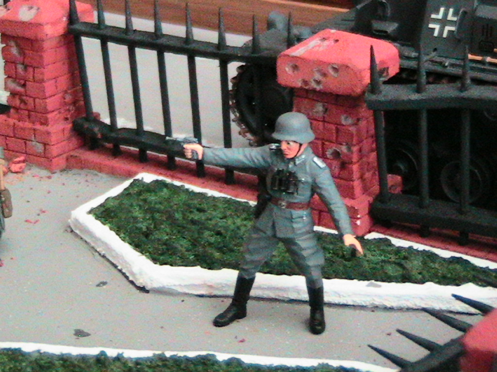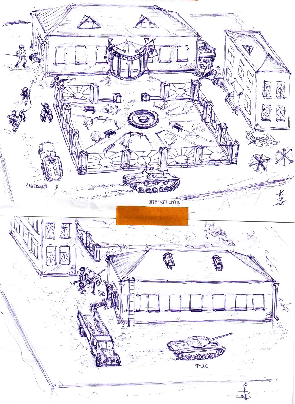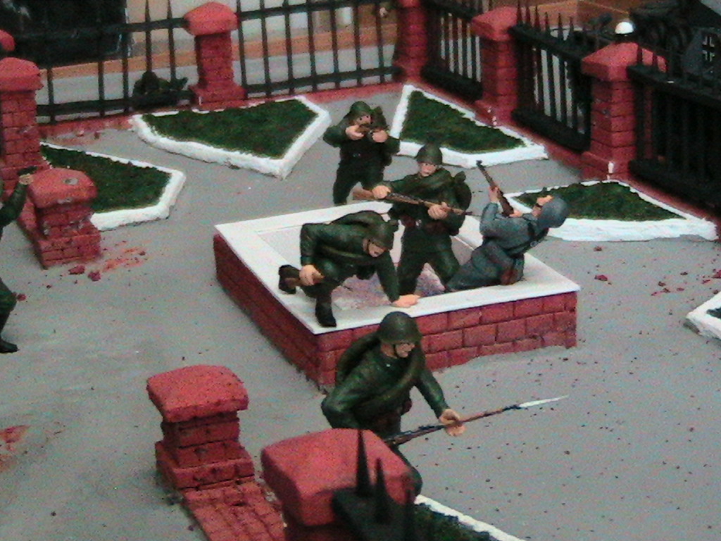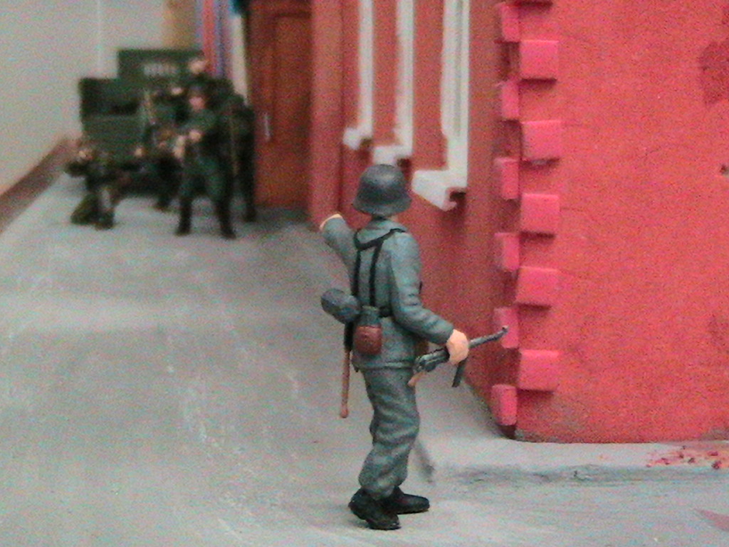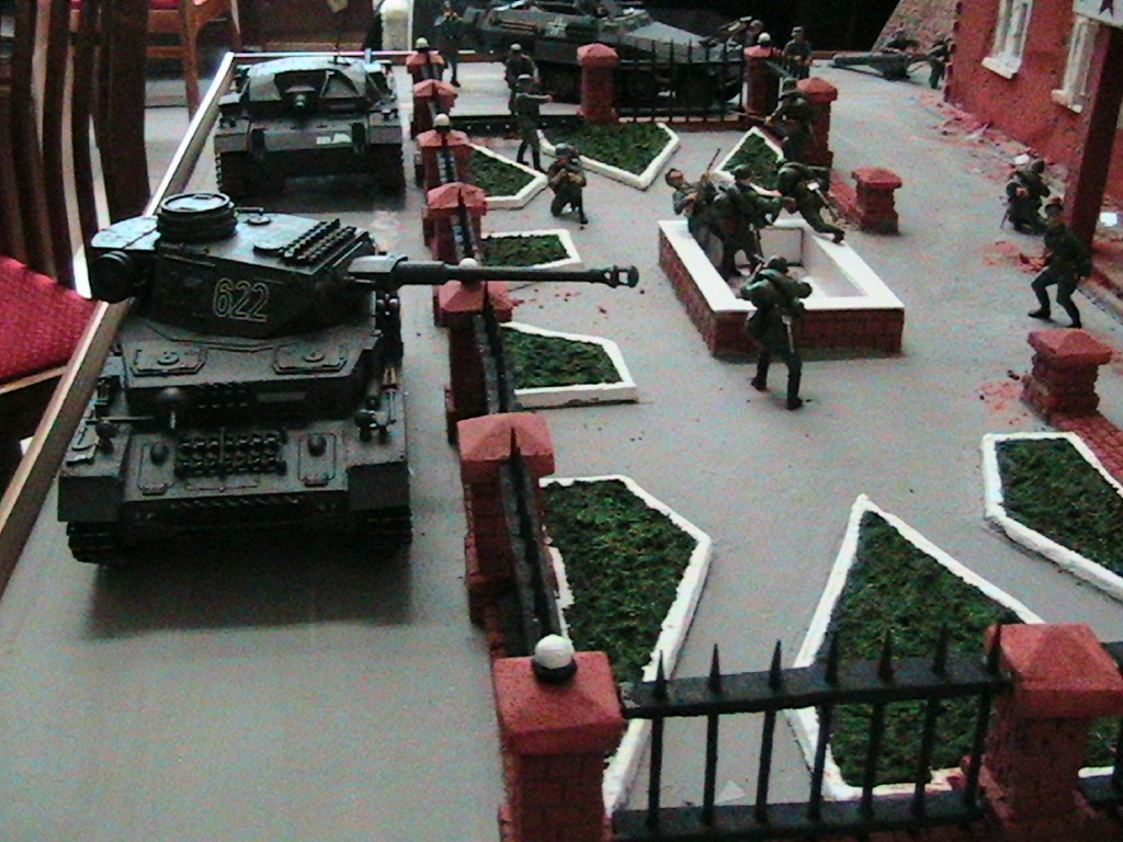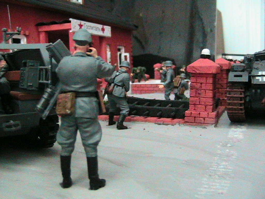По городскому бою, я так понимаю, это совершенствование госпиталя. Добавьте фигурок, например в окнах зданий. Уберите всю фортификацию - это создаст ощущение 1941-го года - нападения не ожидали. Добавлю, что фигурки не должны быть в маскхалатах, как снайперы - в ближайшем тылу их не носили, это вызывало бы подозрение. Удачи)))