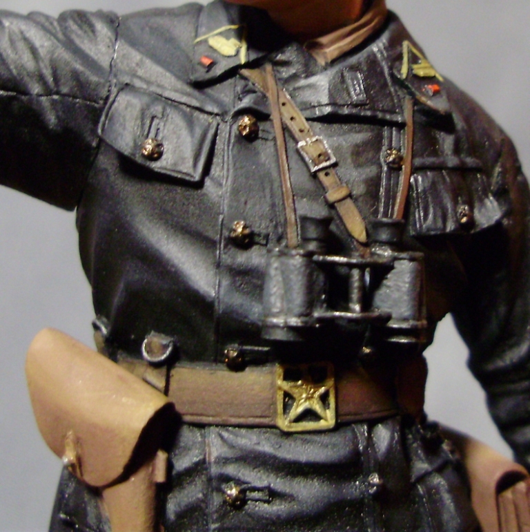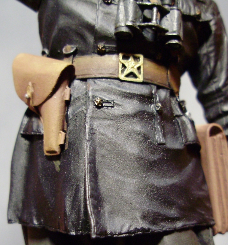 У этой фигурки командира пузыри на шароварах такие же, как на обычных галифе и на кожаные штаны с реконских фоток не похожи, поэтому просто красить их в черный цвет без радикального перетачивания кроя и складок не пойдет. Сделайте обычный хаки, чай не эсэсовец.