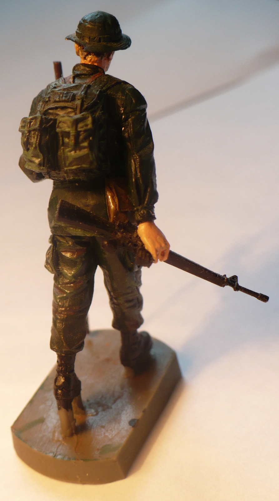 Смоляная фигурка фирмы BRAVO6, красилась тамиевским акрилом около года назад. На цвет формы за основу взят J.N.Green, в углублениях смешаный с водкой flat brown, на подсумках flat black. Выступы и складки делал сухой кистью, салатовым цветом. Ноги были тонированы пигментами МИГ, до получения "мокрого" ощущения. Вариант без каких-либо дополнений и измененний.