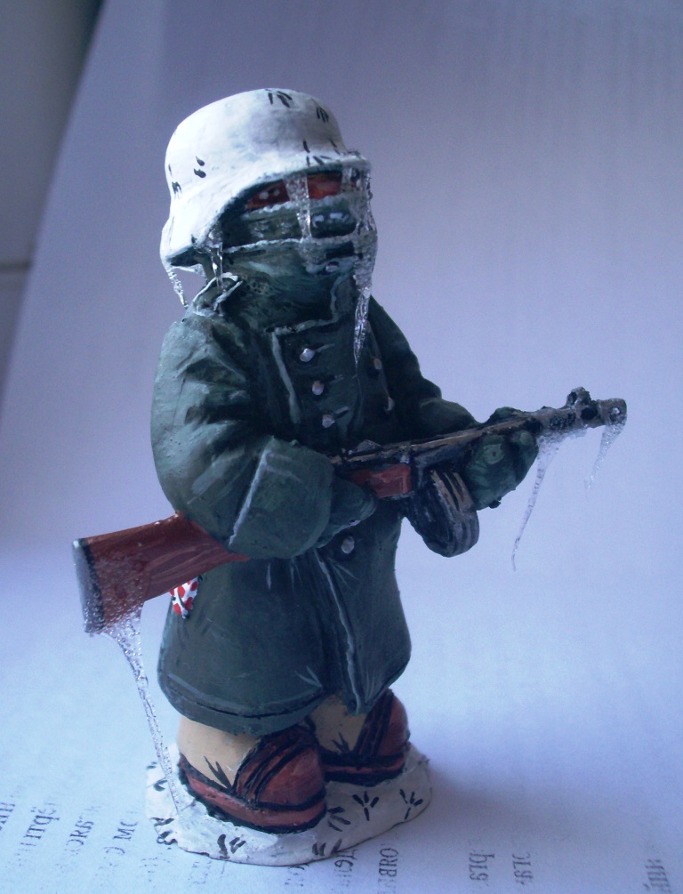 Фигурка вылеплена из пластилина и отлита из эпоксидки,ППШ-41 взят из набора Драгон 1-16 масштаба.Получился этакий недоросль призыванный в адское пекло города на Волге.
