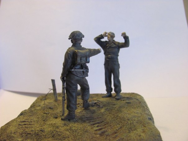 Несовсем понятно из-за разделяющего фигурки расстояния.Если бы бриту коснуться немца рукой то многое прояснится. Тогда и поза немца более понятна: он как-бы немного дёрнулся при касании - вдруг вдарят? И подставку надо ужать, а то правда много пустого места. Было бы более понятно что Томии берёт Ганса в плен.