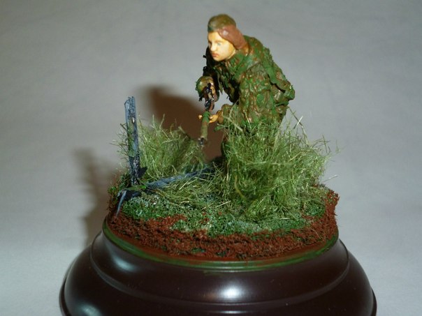 Здравствуйте.С волнением выношу на ваш суд мою первую оконченную работу.Жду отзывов,критики и советов.Фигурка из набора "Звезда"(советские снайперы),основание от "Мини Арт",краски: акрил "Звезда".