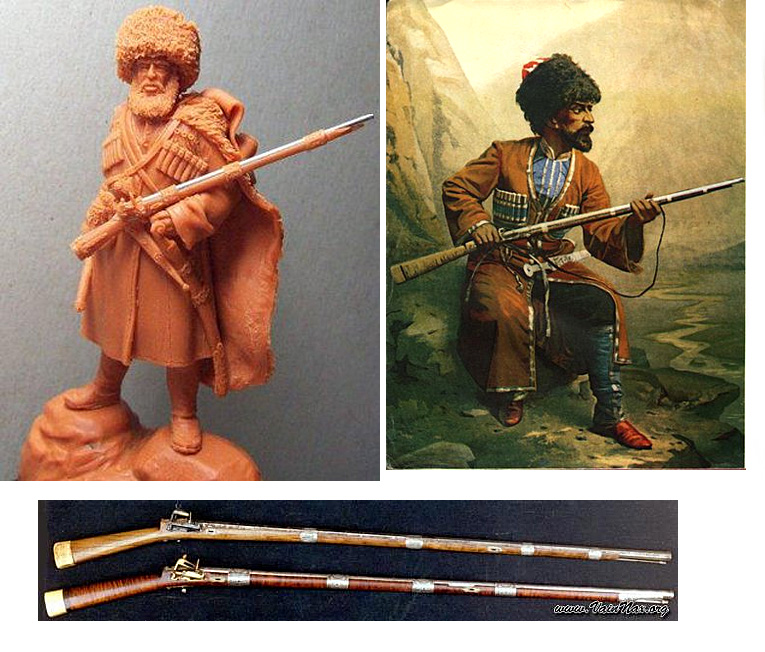 Спасибо за замечание.В свою очередь отвечу.Ружье и ручка нагайки намеренно сделана толще для удобства пролива.Что касается ружья,то они разные были, в том числе и менее изящные.Привожу так же покрой черкески и способы ношения шашки.Что касается газырей, то они соответствуют описанию современников на тот период.Цепочки применялись и несли чисто утилитарную цель-к ним крепились крышки зарядов.Обратите внимание, что они имеют колечки в верхней части.Ну и напоследок-обувь.Поэтому фигура сделана не по мотивам, а как аутентичная ВИМ.С уважением.