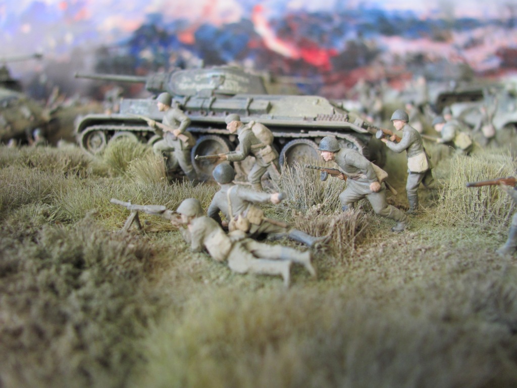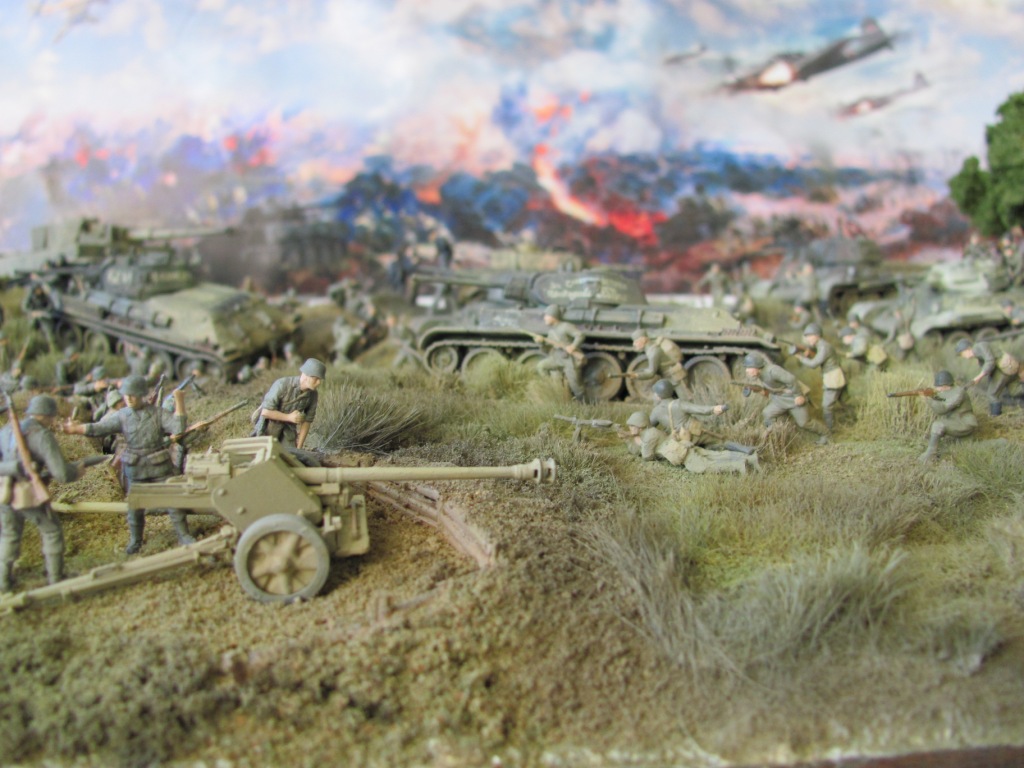 сплелись в атаке люди,танки.........я не большой спец в маштабных диорамах но вроде как перебор.согласен что где то техника могла скопиться так плотно...но!!!что бы солдаты могли в принципе друг дружку булыжниками закидывать лежа!!!ну а так в принципе-масштабная работа!!!
