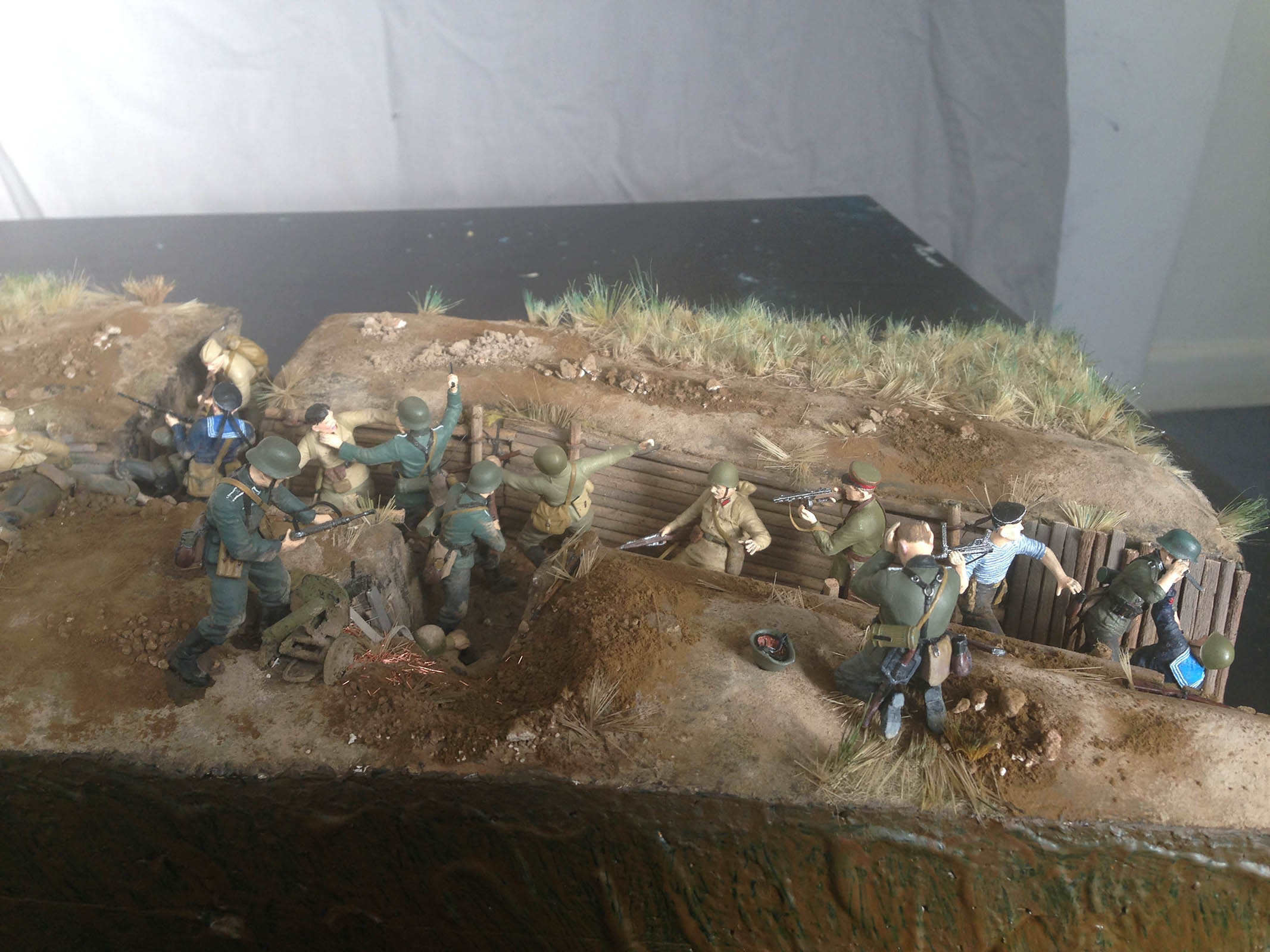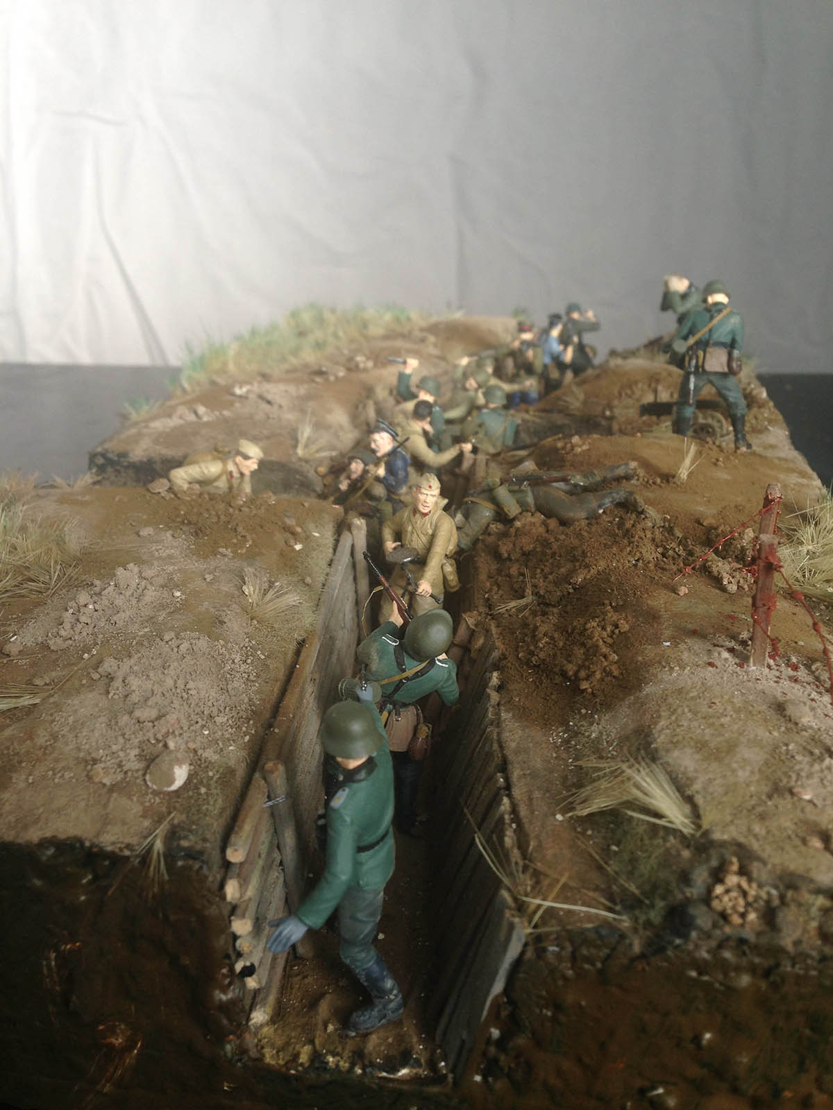 очень понравился ландшафт.Может намного надо было перед окопом змелько побольше набросать,как на той же фотографии,которую показали в сообщении.А почему проволока КРАСНАЯ и как то немного одиноко стоит.я то конечно и так не умею и не разу не пробовал.но кажется,что вот такие ровные пучки немного портят атмосферу.про фигурки уже сказали.