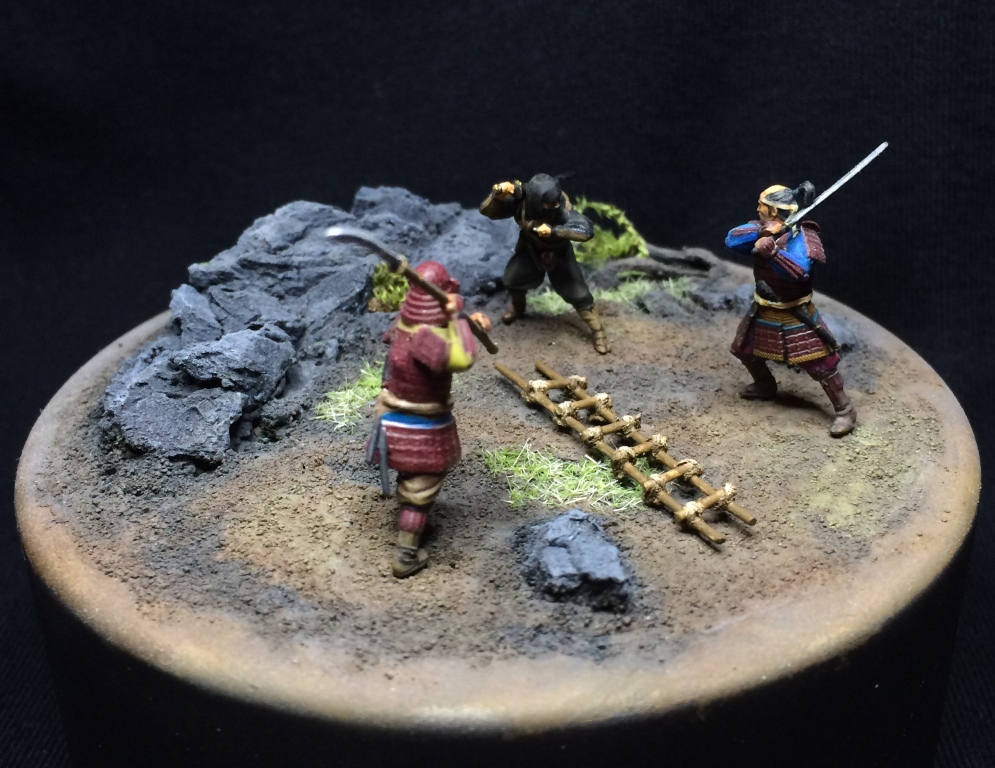 Если честно, мысль изначально была, просто схватка 2 на 5, потом упростил до 1 на 2. В процессе начал искать инфу о синоби и самураях. И да, 47 ронинов, восстание Ига и севера Кога. Задумок много было. Одна из - замок Дайме, в два этажа с разрезом. Внутри прием послов. Внутренний двор - тренировка самураев. Частокол и за ним рисовое поле с крестьянами. В ворота скачет гонец, но синоби уже на крыше и скрытно во дворе.
