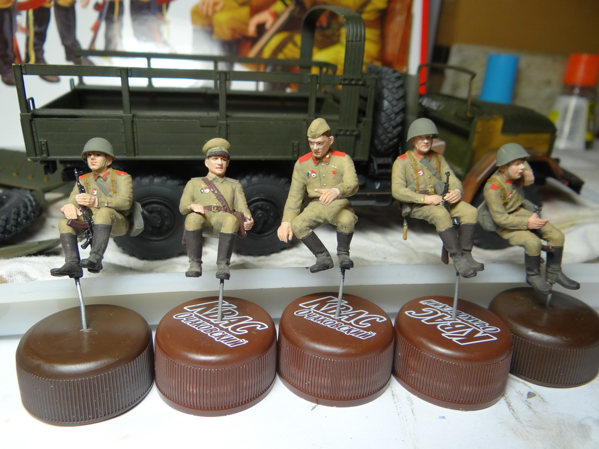 Первый опыт техники с движком, трансмиссией, поэтому работа затянулась, ходовую часть пришлось красить до сборки кузова. Качество моделей SKIF сами знаете какое, в прилагаемой документации и на самой гаубице не показано посадочных мест для монтажа мелочевки. Стрелков в артиллеристов превращать не стал, красил как есть по коробке. Краски для техники - Tamiya XF и Акан, для стрелков - питерская темпера.