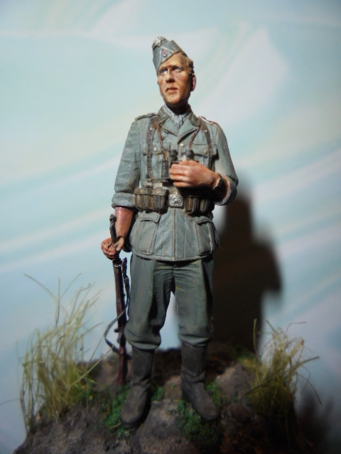 Первая любовь-это не название работы,а фигурка,открывшая долгий,фанатичный путь к качественным смоляным миниатюрам.Расписывал где-то шесть лет назад.До сих пор помню,как принес две фигурки"Альпайн" домой и два дня гладил руками аккуратные складки и ремни,боясь приступать к окраске.Помню,как испытал эйфорию от того,как краска сама ложилась на фигуру.Поэтому всем начинающим советую,ну накопите,блин,на качественную смолу или купите вместо пяти плохих одну хорошую.Не верьте корифеям,которые говорят,что тренироваться надо на..."Звезде".Потеряете время,а удовольствие не получите.Начните с"Хронос"."Эволюшен",ну и "Альпайн"со"Сталинградом".Фигурка масштаб 1:35 красилась наборами"Андреа колор",Валеджио.Ничего переделывать не стал,оставил со всеми косяками того времени.Перенес только на новую подставку.Ремни,по-моему делал из ф.т.Фигурка зацепила какой-то внутренней отрешенностью немца от этой ужасной войны.Да,и выставляйте больше своих работ в этом разделе.Не коситесь в сторону галлереи с мыслью"Я так не смогу".С чего-то надо начинать!Всем удачи!