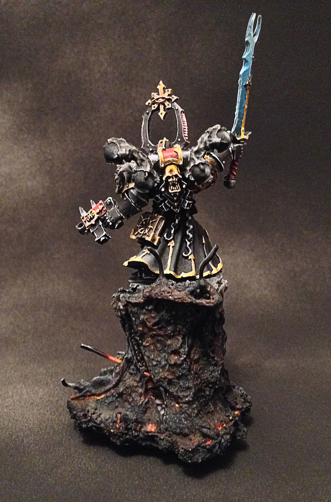 Миниатюра от компании Gameswork Shop - колдун космодесанта хаоса (Warhammer 40k), материал смола, роспись красками Valejo Game color, подставка из утеплителя для стен (не уверен, что он именно так называется), песочек, камушки.
