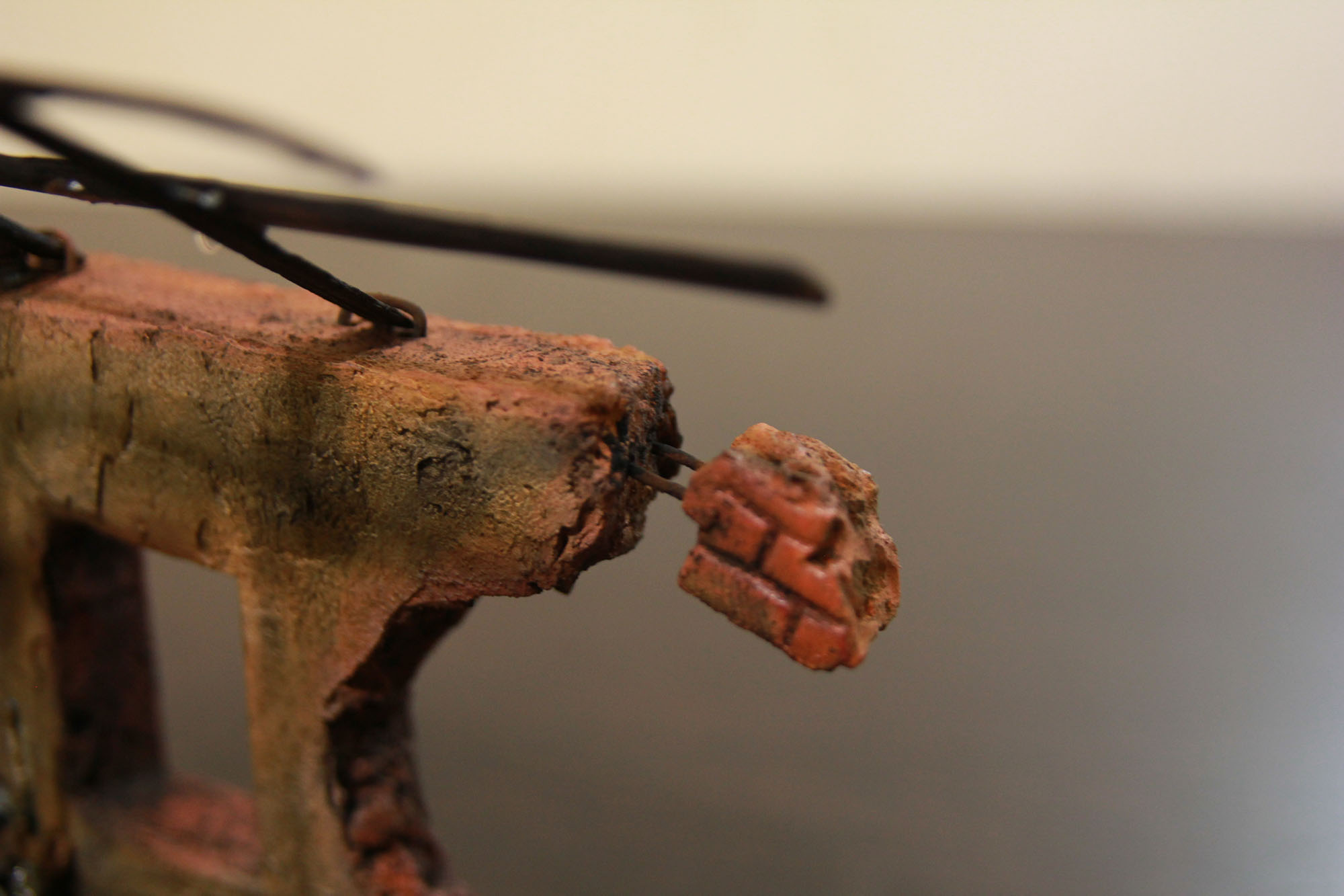 Кирпичи вырезал из пластика, покрасил их в цвет кладки и засыпал сажей.