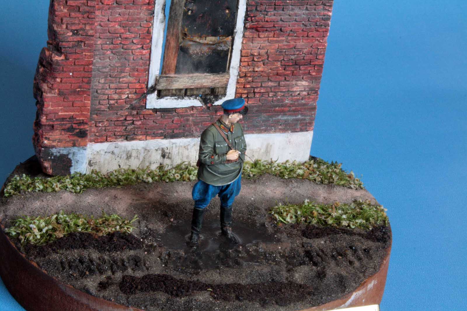 Идея была такая. Изобразить офицера НКВД , стоящего у развалин в луже грязи…