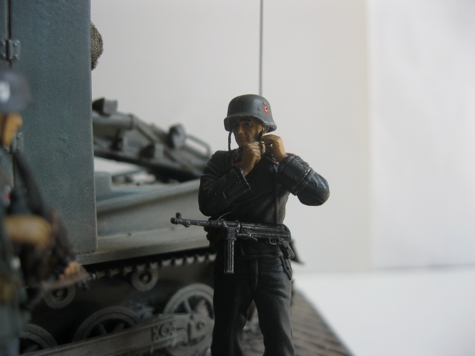 Фигурки от Dragon, подобраны для того времени. Была идея сделать именно танкиста и пехотинца. Раскрашивал форму по технологии В. Демченко (правда на танкисте не совсем видать то,чего я хотел добиться). Молнии на петлицах нарисованы вручную,равно как и свастика на каске.