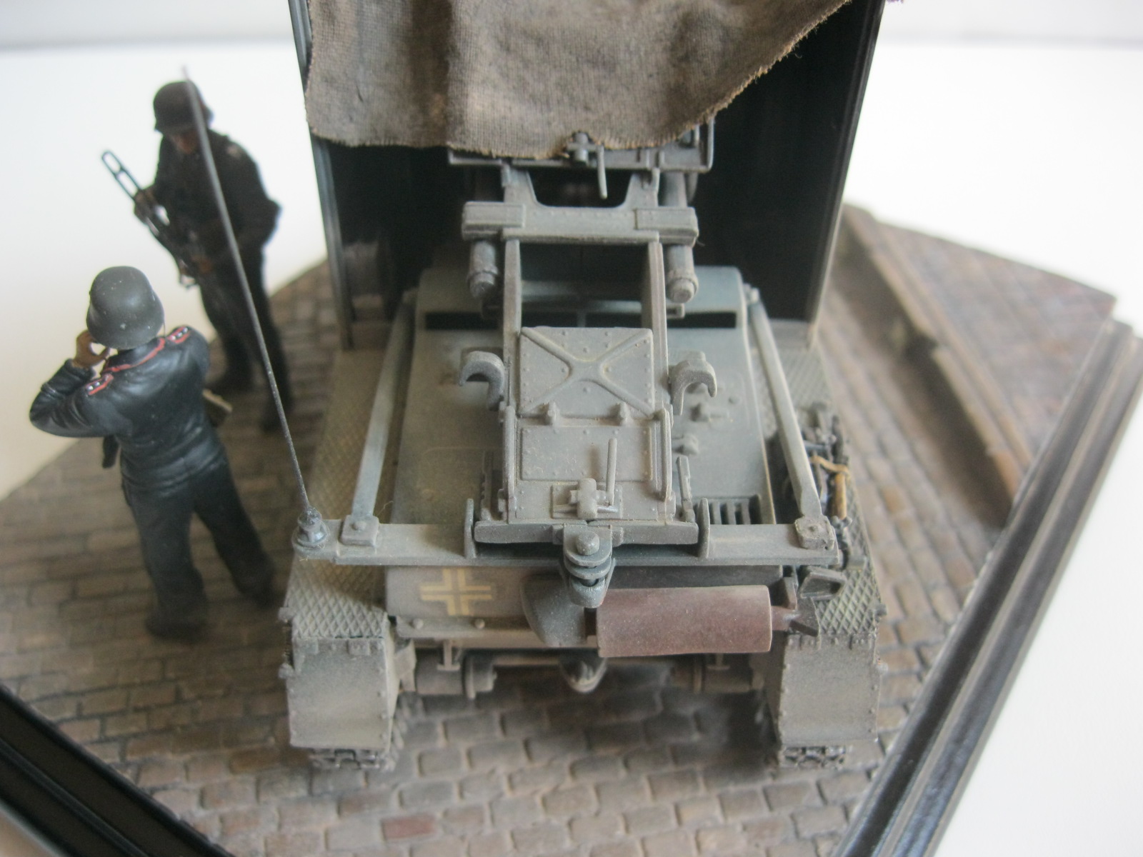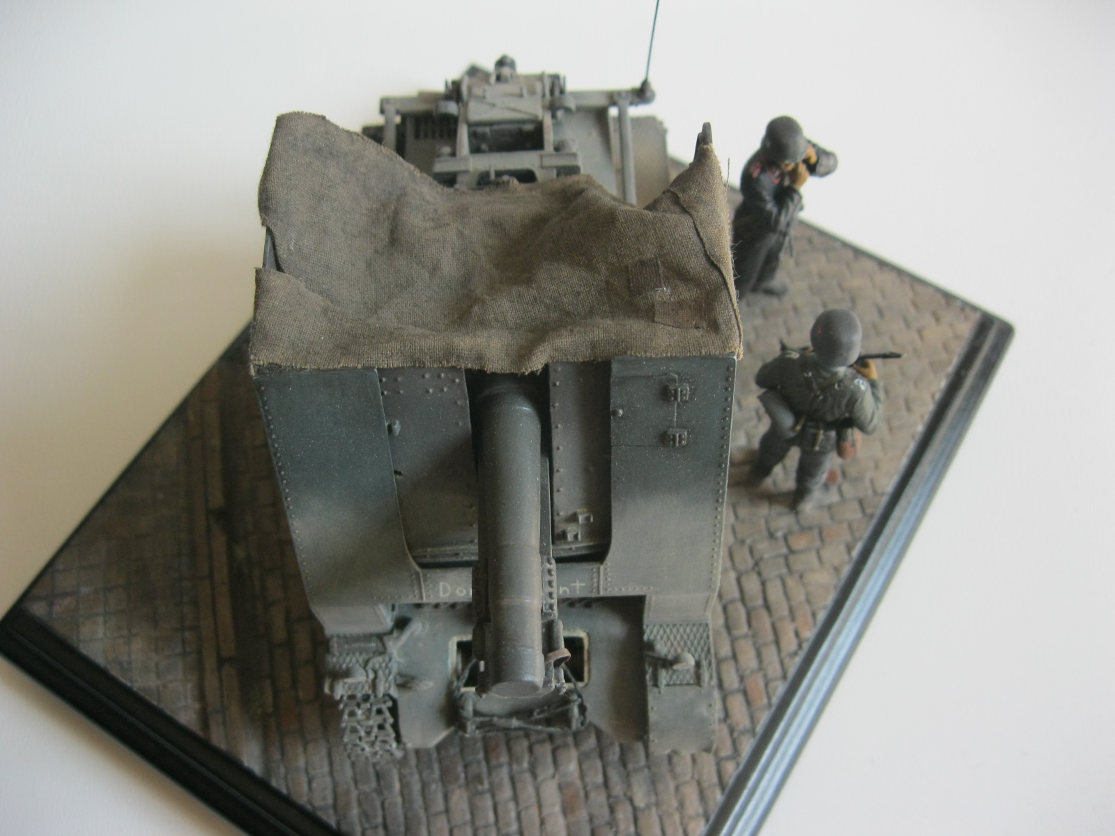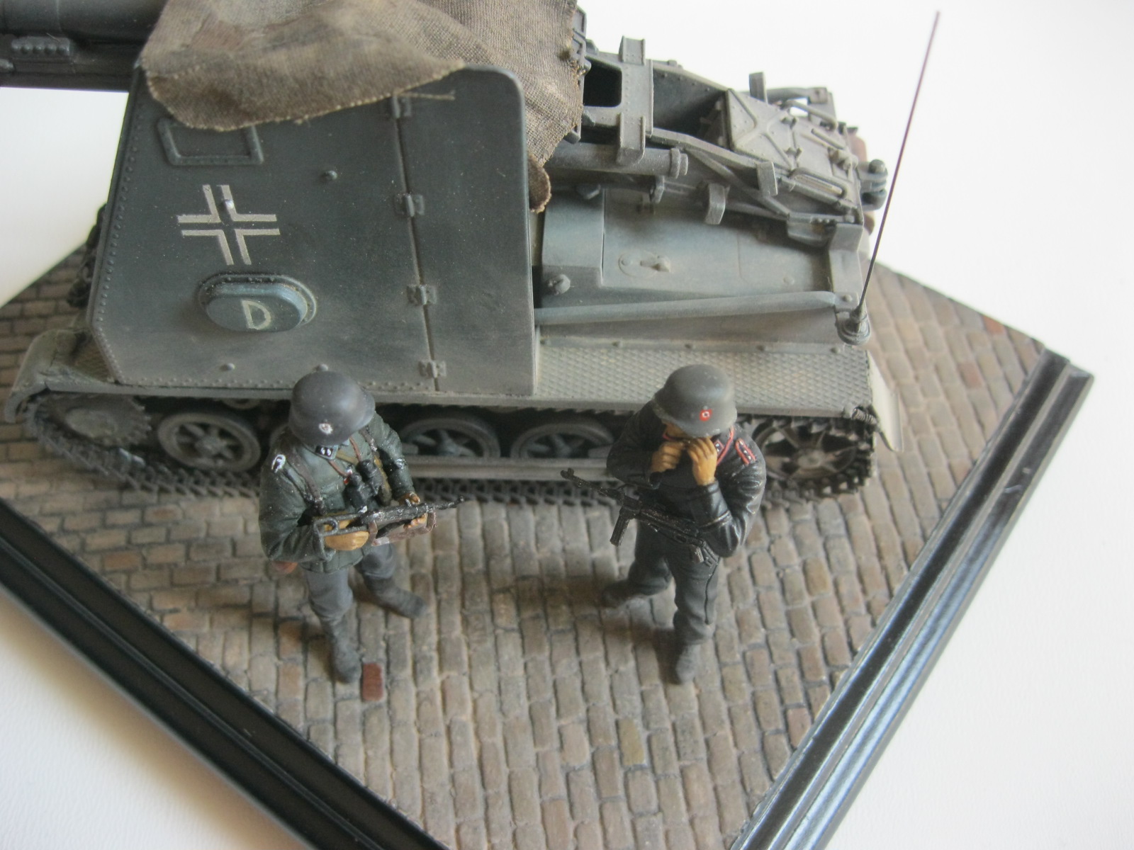 Основание выполнено из фанеры,брусчатка-смоляная копия миниартовского набора. Раскрашена масляными красками. Тонировка фигурок и самоходки-смывка и пастель,окраска САУ- Tamya и Revell. Масштаб 1:35.