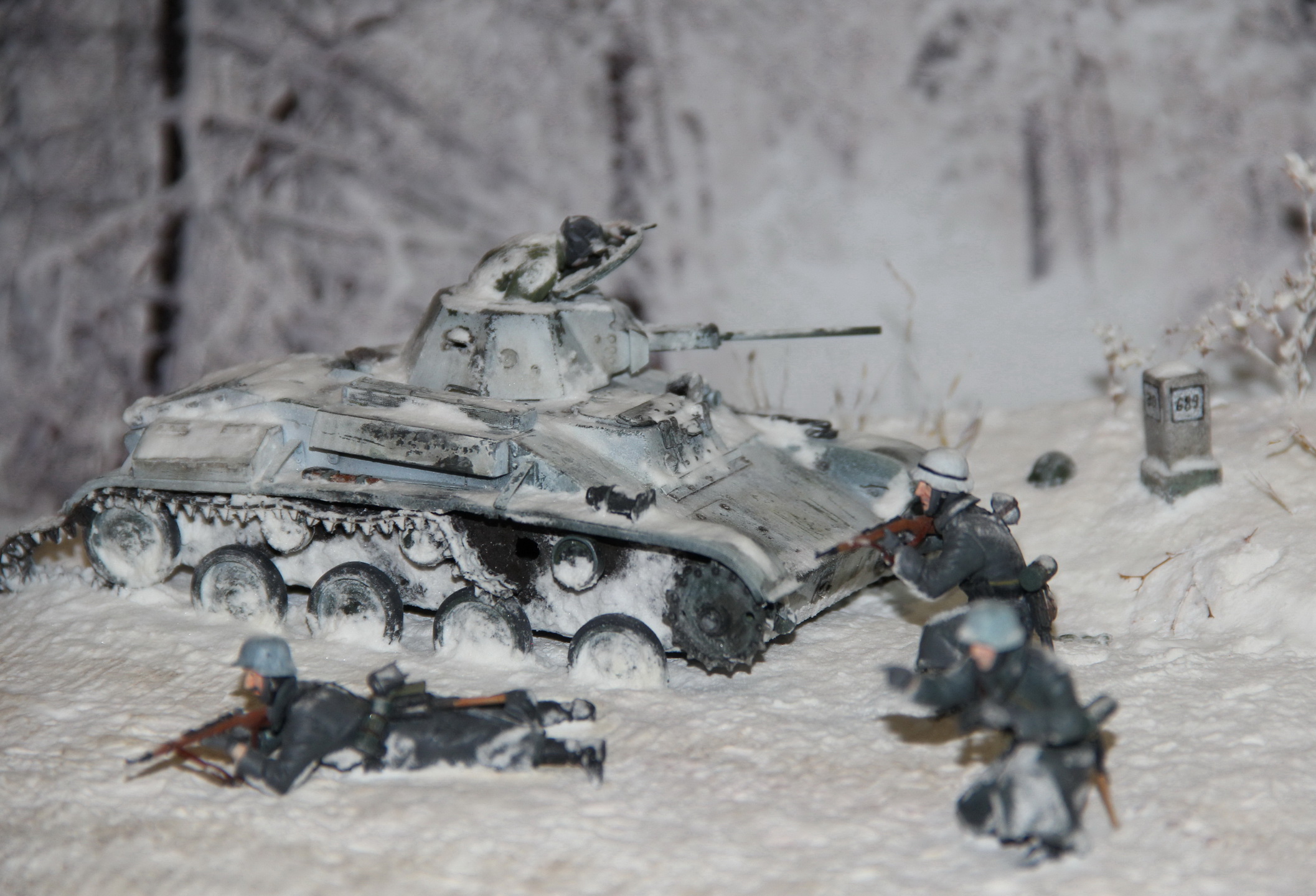 Окрашивалось все Звездинским акрилом. Зимний камуфляж танка – с использованием обычного лака для волос (распылял прямо из баллона без аэрографа). Танк тонирован маслом на пинене. Снег – сода, ПВА, темпера. Километровый столбик отлит из гипса. Трава и кусты – сухостой, веточки от веника и малярная кисть.