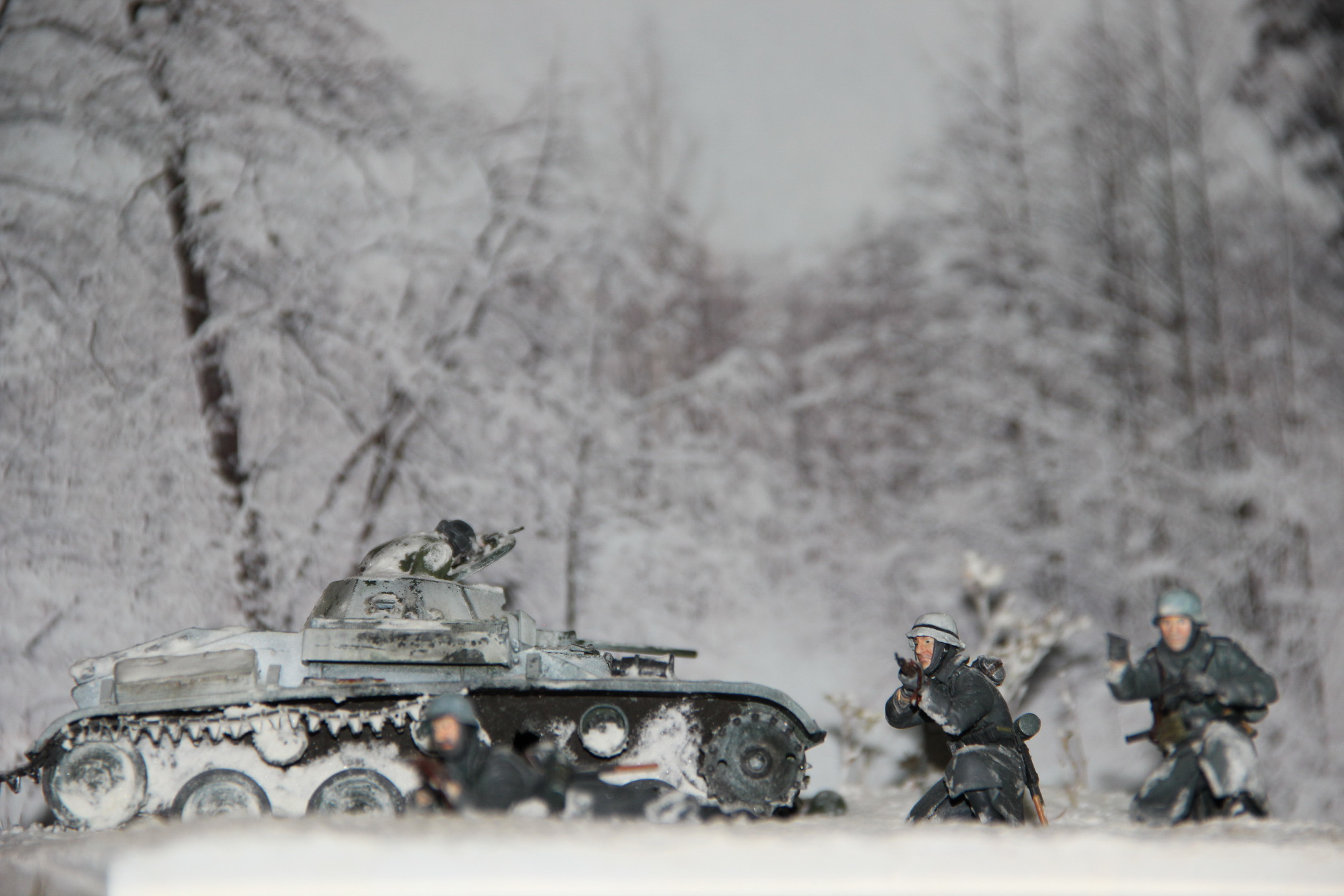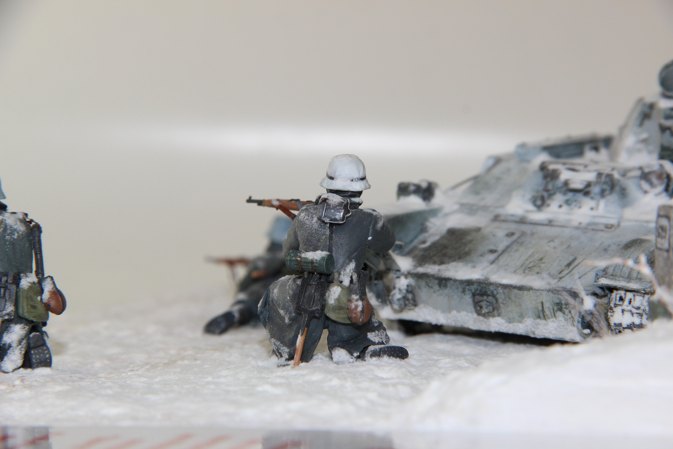 Немецкая пехота - от Звезды, четвертого солдата из набора использовать не стал (как-то он бегущий не вписывается в общий сюжет). Фигурки собраны практически «из коробки», добавлены ремни на оружие, каски заменены из другого набора, котелки – доработанные из набора ICM. С сухарками косякнул: изначально не разобрался со способом их крепления и средний крючок приклеил тоже поверх ремня, а не под него, пришлось маскировать снегом.