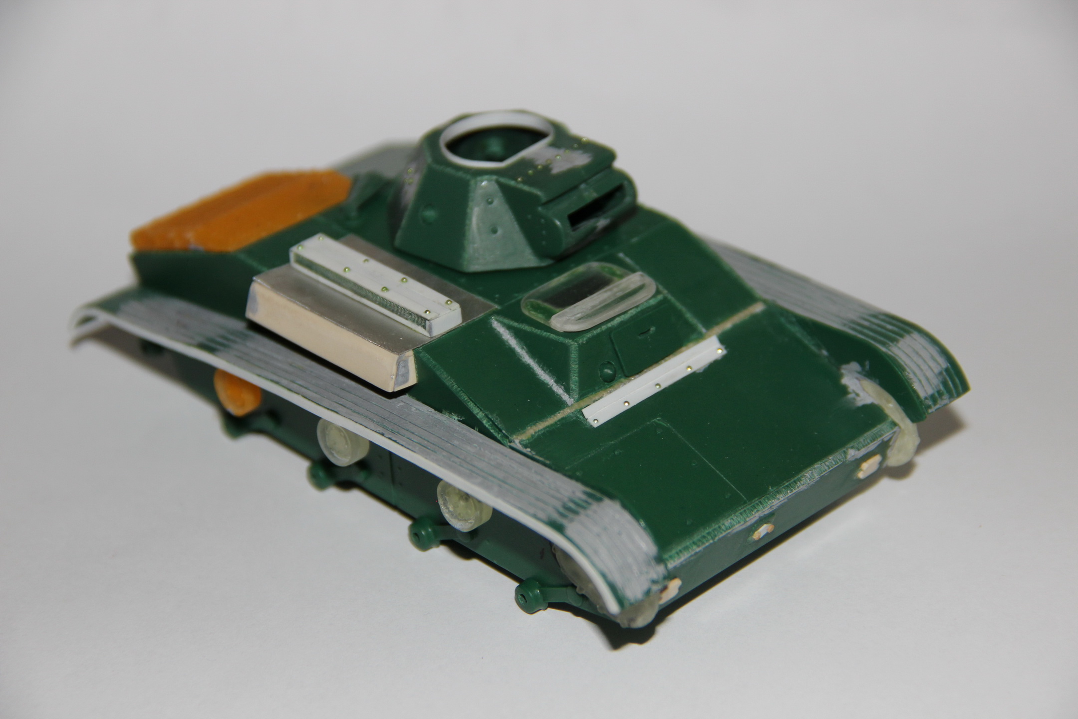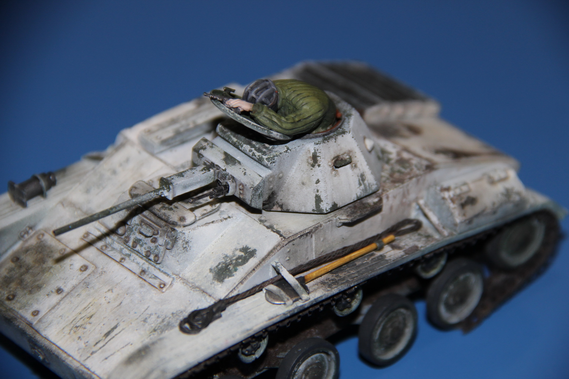 Древняя модель Т-60 от Звезды лежала несобранной лет 20. Выбрасывать конечно жаль, решил довести ее до ума подручными способами. Изначально планировал просто густо засыпать весь танк снегом, спрятав под ним все косяки (была как-то такая виньетка на Диораме и ее же фото в М-Хобби), но в процессе втянулся и вошел во вкус запиливания. Из афтемаркета пришлось приобрести смоляные гусеницы от Мастерклуба, поскольку сделать гусеницы самостоятельно задача фантастическая. Надо сказать, что с гусянкой сильно намучился (собранные в звенья по 10-12 траков они искривляются по дуге, защелки держат плохо), но возможная альтернатива в виде металла от Фриул даже не рассматривалась из-за непомерной стоимости. Также с достаточной долей условности афтемаркетом можно назвать смоляные ящики ЗиП и надмоторную решетку от пензенского Танкомастера, хранившиеся все это время вместе с базовым набором. Знаю, что у них неверна форма петель и нет имитации барашков, но все-таки оставил эти детали. Геометрия корпуса и башни не исправлялась, были исправлены лишь крупные косяки, бросающиеся в глаза: надмоторные решетки, короб воздухозаборника (доширак, фольга, сеточка от чайного пакетика), люки мехвода (пластик из упаковки от CD дисков). Косынки, уголки, петли люков, буксирные крюки – из доширака и фольги. Заглушки пистолетных портов выточены из литника. Орудие – игла от шприца, ДТ – тоже из иглы, обернутой полосками фольги-самоклейки. Заклепки – микробисер, головки болтов – тянутый шестигранный литник. Клаксон – из литника и доширака, фара – полностью самодельная. Надгусеничные полки оставил родные, но сточил неверный рельеф и нарезал новый, закраины – доширак. Ну и «ведро шпаклевки». Сварные швы имитировал всеми возможными способами – из шпаклевки, из тянутого литника и просто нарезанные модельным ножом. Катки – самодельные смоляные копии от СУ-76 (Алан), кожухи бортовых редукторов и ведущие звездочки тоже, но доработанные «с помощью напильника и мата». Шанцевый инструмент и домкрат – смоляные копии с разных наборов. Буксирный трос – из обычного медного электропровода ШВВП.