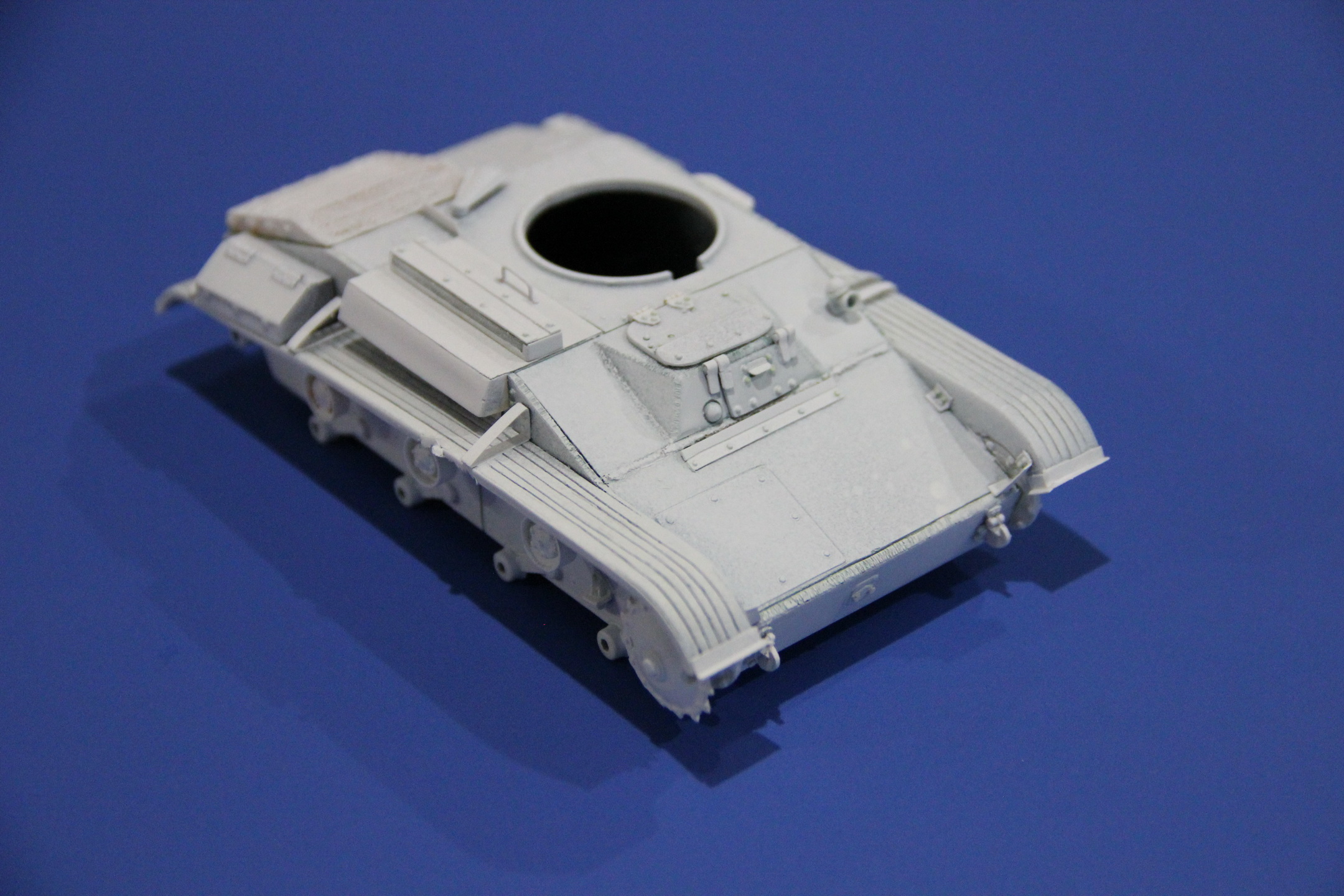Интерьер делать не планировал, но поскольку подбитые танки имеют, как правило, открытые люки, то пришлось внедрить фигурку погибшего танкиста чтобы закрыть зияющую пустоту (так что это ни в коей мере ни есть самоцель изображения убитых на диораме). Тело – самоходчик от Миниарта, голова – Звездинский танкист, револьвер – Мастербокс (контратака).