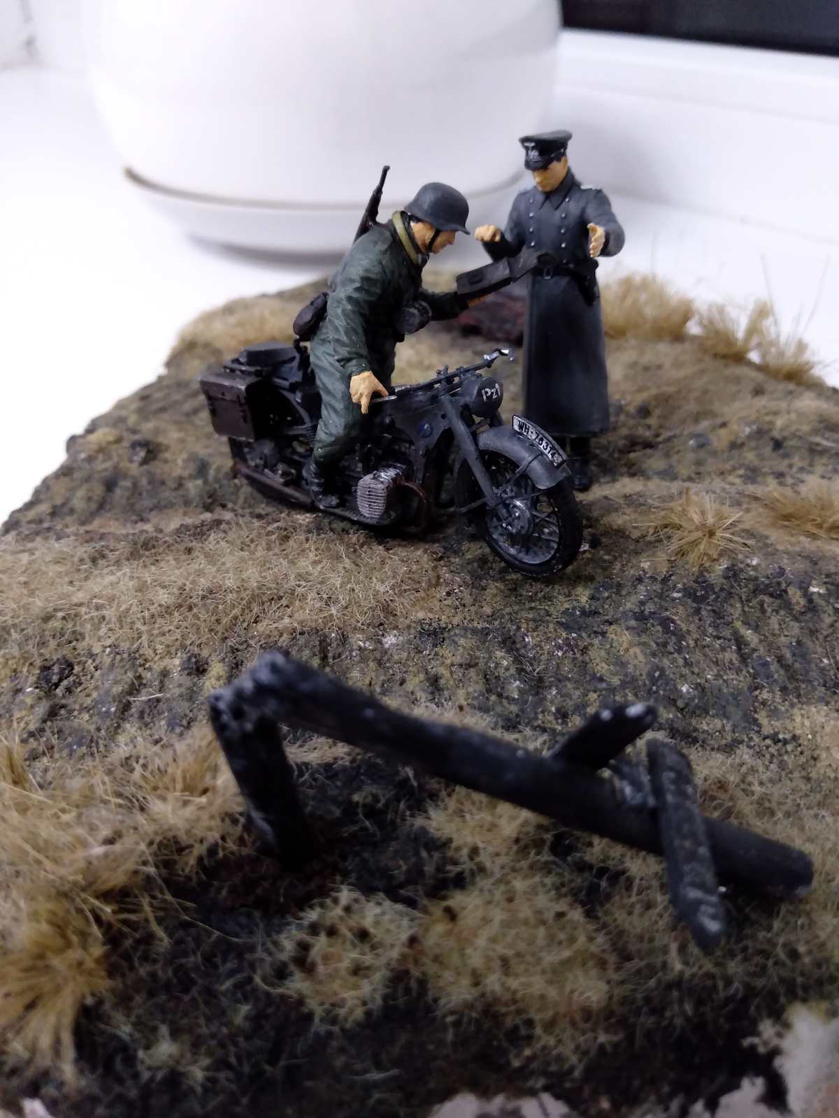 Здравствуйте. Долго не решался выложить фото одной из немногих своих диорам. Занимаюсь этим относительно недавно, так что не судите строго.Многому ещё предстоит научиться. Использовал набор Немецкий тяжелый мотоцикл Р-12 с водителем и офицером в масштабе 1:35. Краски тоже от фирмы Звезда. Аэрограф не использовался, т.к. его попросту нет. Остальное видение диорамы возникло в голове.