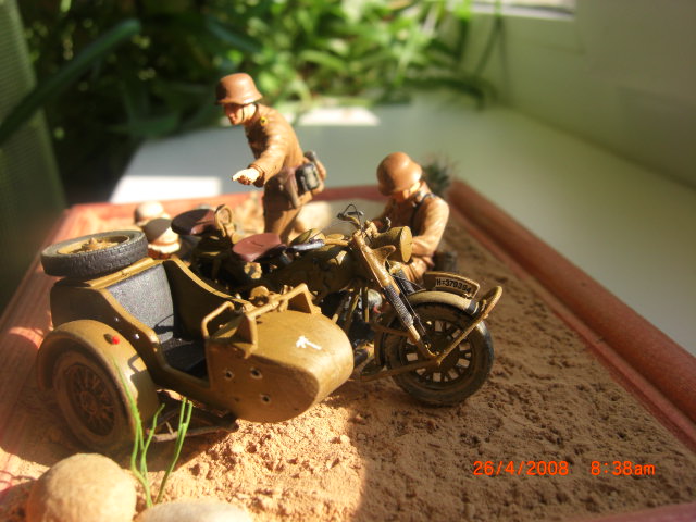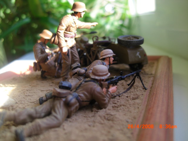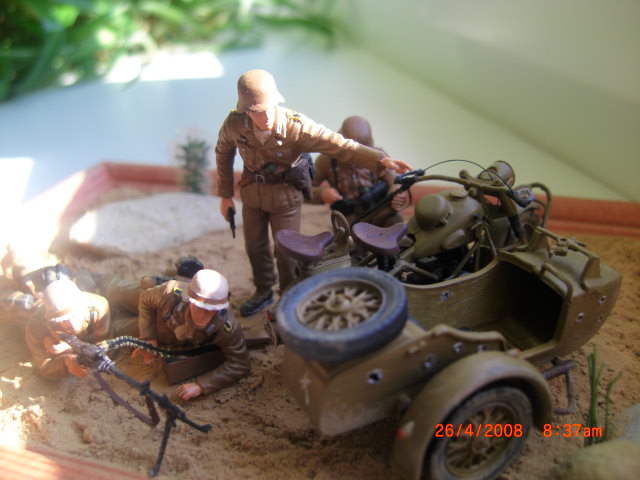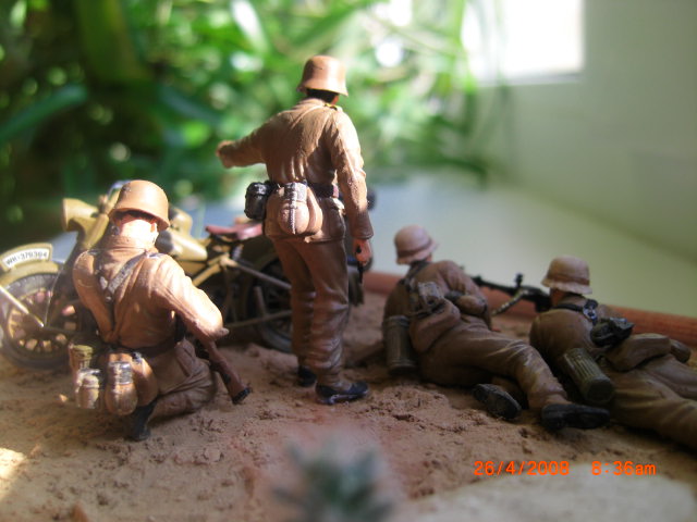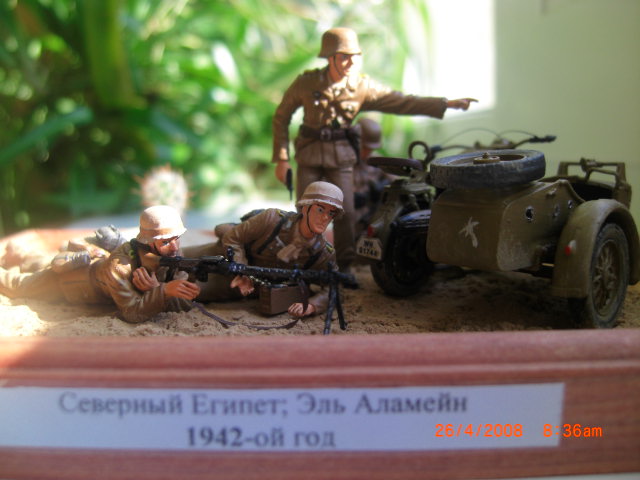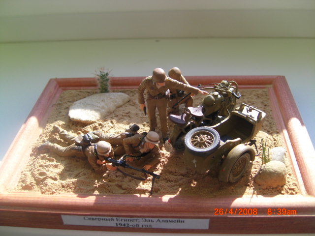 Черноморец, Называется диорама Ложись!...Засада!. Суть в том, что немцы ехали на мотоцикле( четвёртый попутчик на колесе сидел) А тут откуда не возмись английские солдаты. И немцы сразу с мотоцикла выпрыгнули пулемёт сняли с мотоцикла и начали полить в ответ.))) А мотоцикл использовать как укрытие всё таки лучше чем с голой ж... по пустыни бегать.)))