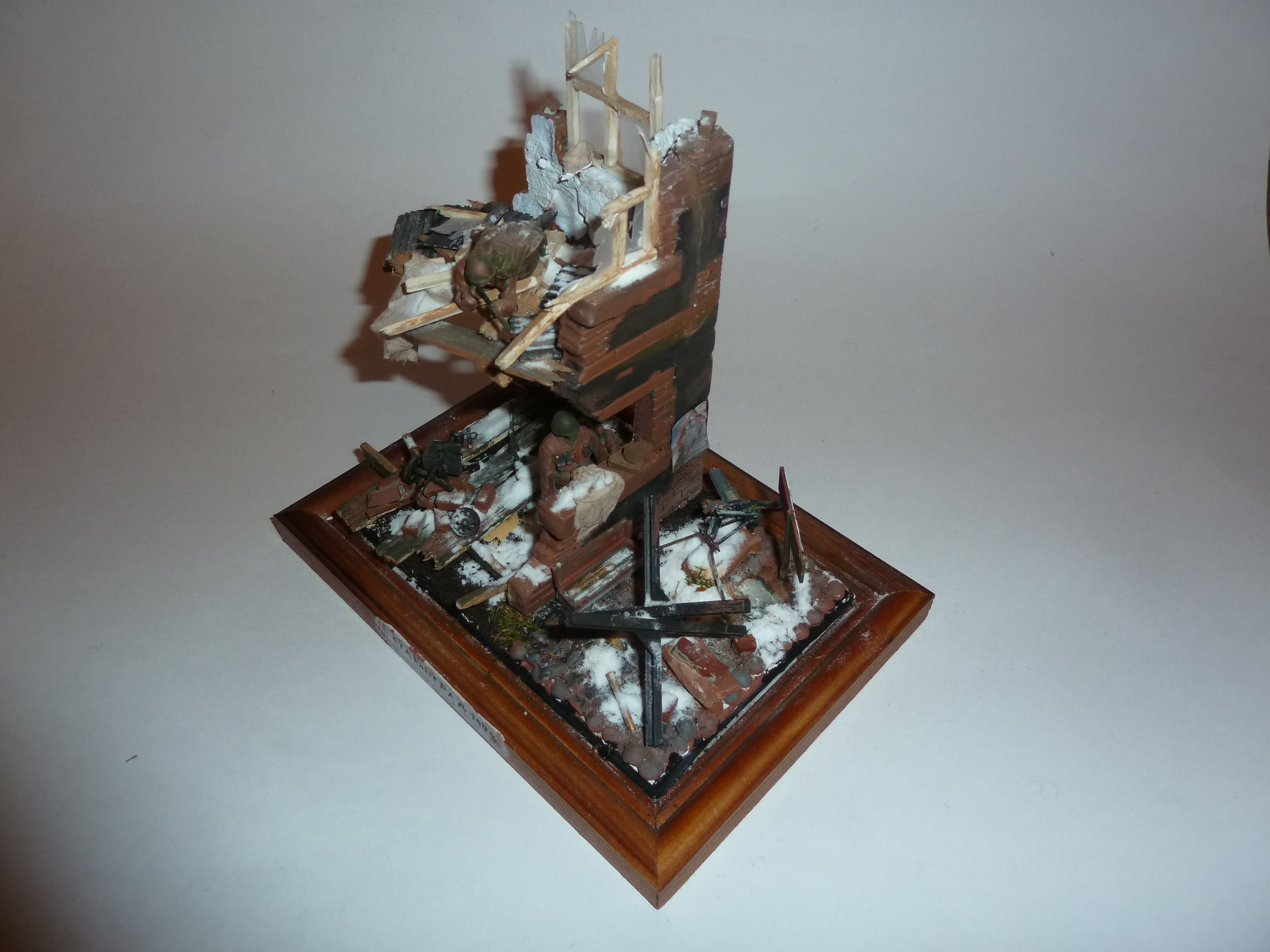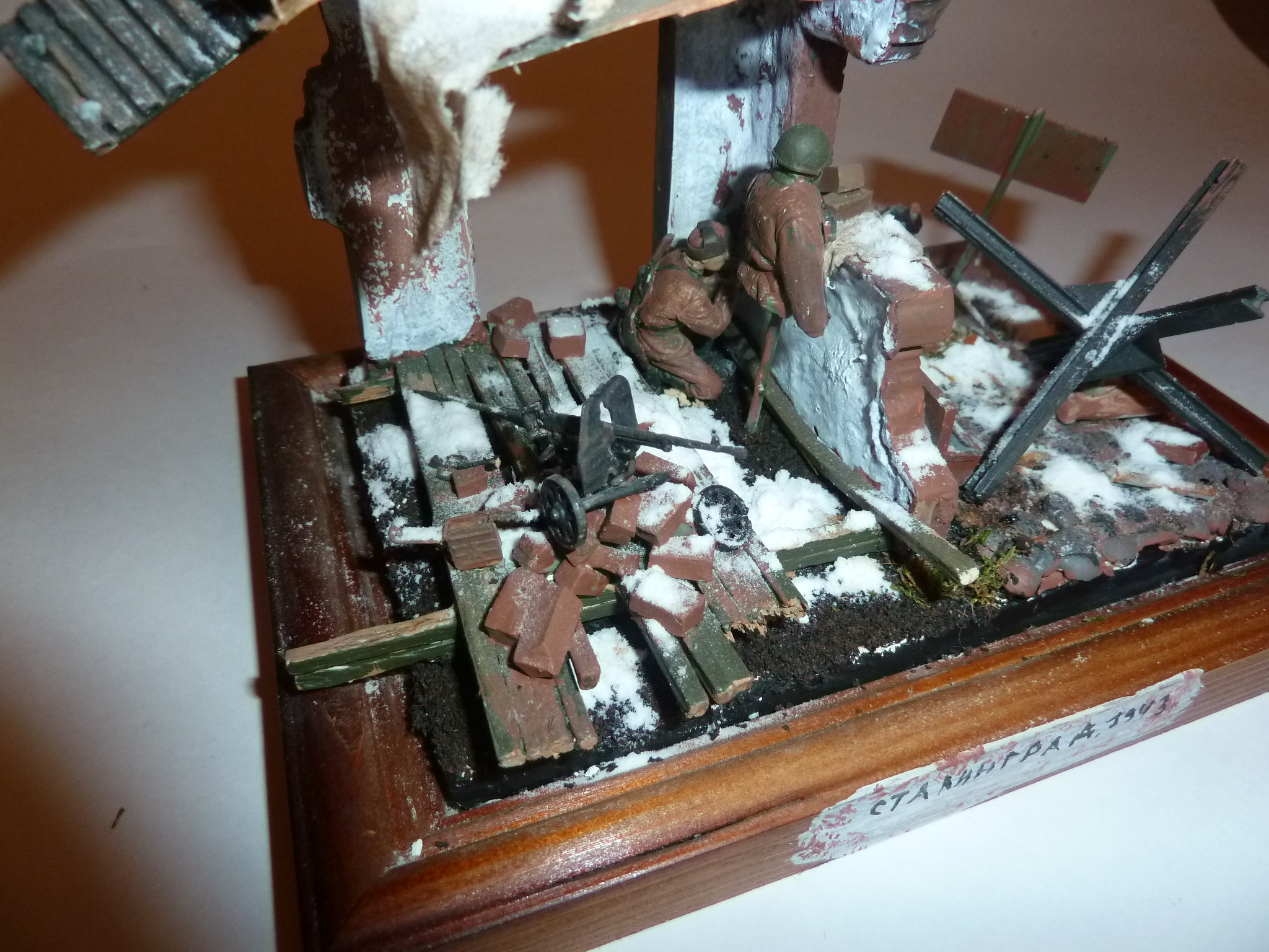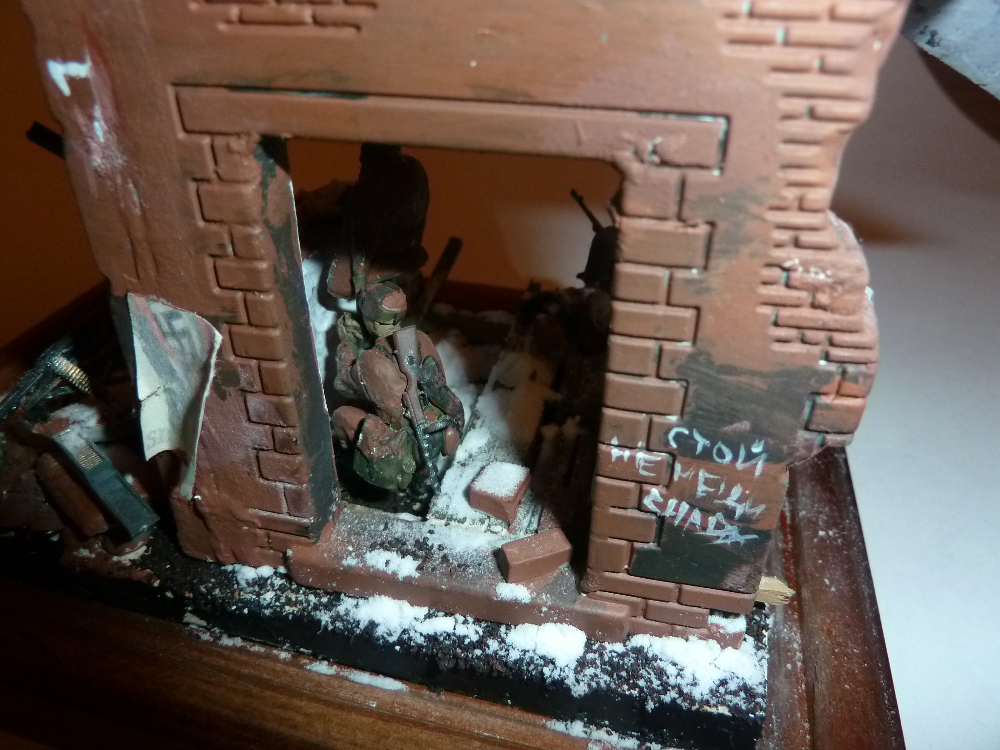 Наконец доделал старую задумку.Для работы взял старые фигурки фирмы ZVEZDA (советские снайперы). Красил всё акрилом ZVEZDA включая и саму диораму .(ОСНОВАНИЕ)Фоторамка.Отливал форму из гипса,брусчатку выкладывал из гороха половинками как из статьи "На улицах Харькова "щели между ними засыпал песком,под зданием основу высыпал из чайной заварки. Снег сода+пва.Лужицы эпоксидная смола.(ЗДАНИЕ)Угол дома был взят из детского набора для солдатиков,и доробатываался мною: пол,рамы окон палочки для конструирования. Второй этаж перекрытие дерев.линейка. Тряпки-туалетная бумага смоченная в воде с пва. Листы железы обыкновенный картон в разрезе.Стёкла битые,в раме- тонкое оргстекло.Кирпичи-глина для лепки. Агитационные плакаты распечатаны на принтере и состарены.(МЕЛОЧЁВКА)противотанковый ёж , снаряды,гильза,пулемёт mg-42на мешках с песком,да и сами мешки-из различных наборов TAMIYA. Пулимёт-СГ43на куче кирпичей и винтовка-Мосина,ZVEZDA.Жду конструктивной критики,советы и.т.п.