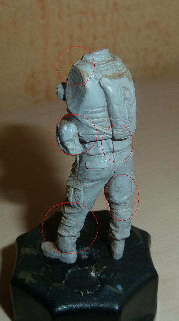 Вы уже сколько здесь работ выложили? И везде были одни и те же советы - "аккуратней, тщательней, не торопитесь". И снова-здорово: фигурка собрана с перекосами, швы не зашпаклеваны, литьевые швы не зачищены, загрунтована фигура кое-как. Над Вами кто-то стоит и гонит Вас? Можно быть аккуратнее? Специально обвел красным проблемные места - неужели сами их не видите? Вот это прочитайте на досуге: http://www.diorama.ru/workshop/features/47/