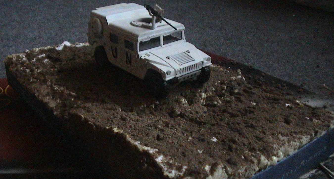 Уважаемый ,а с чего Вы вообще решили что это диорама?Блин,недостаточно просто взять "Хаммер" или ,например,Т-34, поставить его на грунт и объявить,что это диорама..Во -первых без людей любая композиция мертва,во-вторых нет никакой растительности; это не проблема для пустынного ландшафта- сейчас середина лета уже много травы пожухло, сходите на пустырь и нарвите подходящей-только чтобы была масштабной .Основание нужно ОБЯЗАТЕЛЬНО чем-то обрамить.Наконец в диораме должен быть некий,лучше неизбитый и оригинальный ,сюжет.