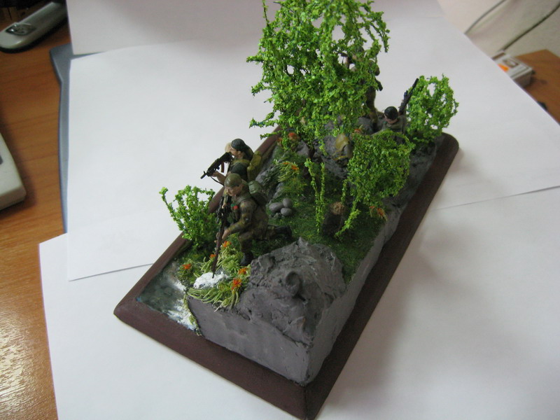 Мне нравиться,не хилое разнообразие зелени.,,единственное не понравилась,скала? грунт? однотонно серого цвета,сделайте пару смывок темно-коричневым или черным,пройдитесь сухой кистью светло-серым и добавьте немного пыли пигментами или натуральной.Думаю только выиграет работа.