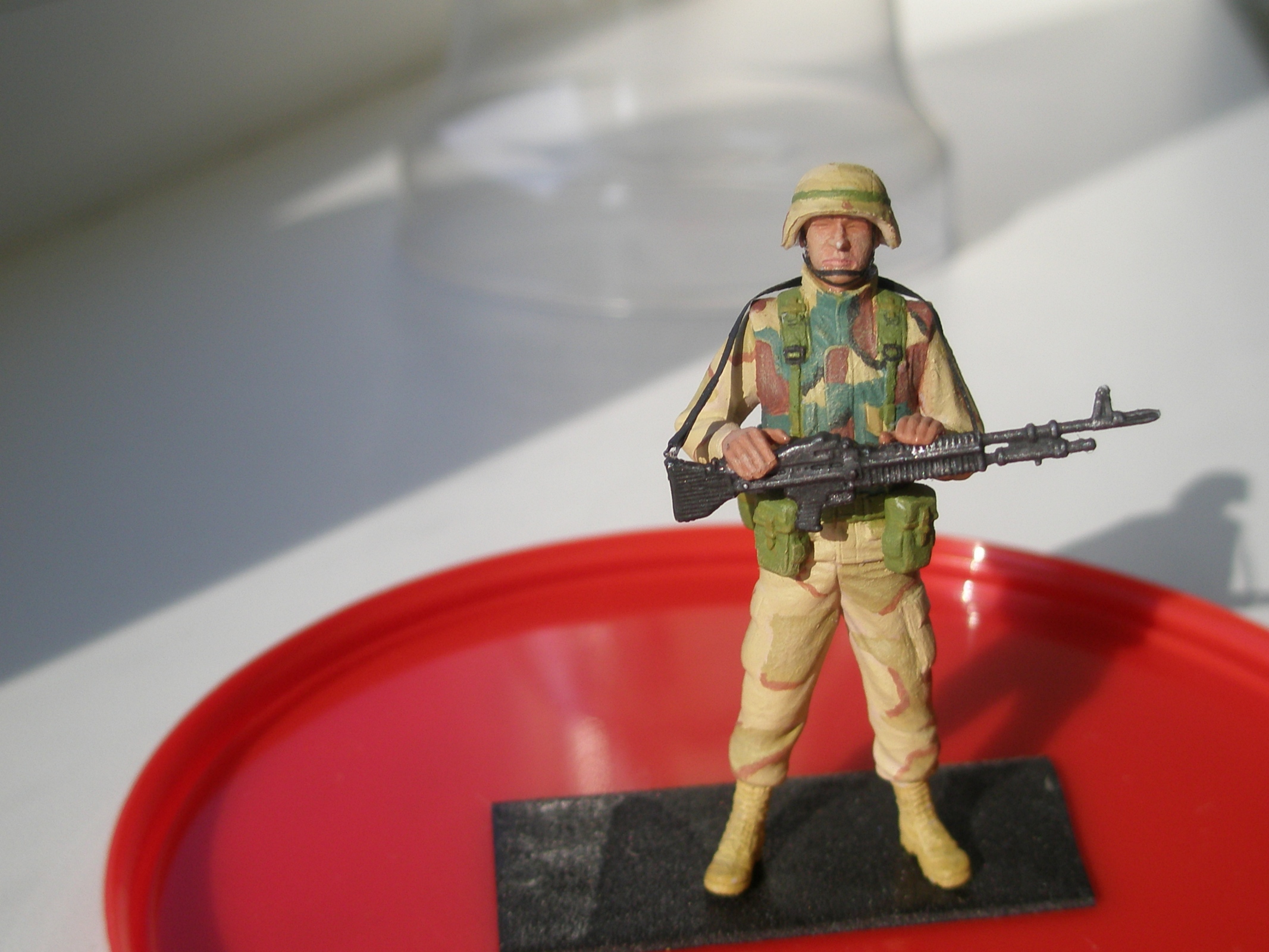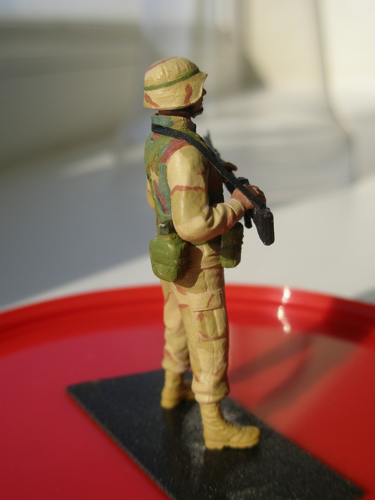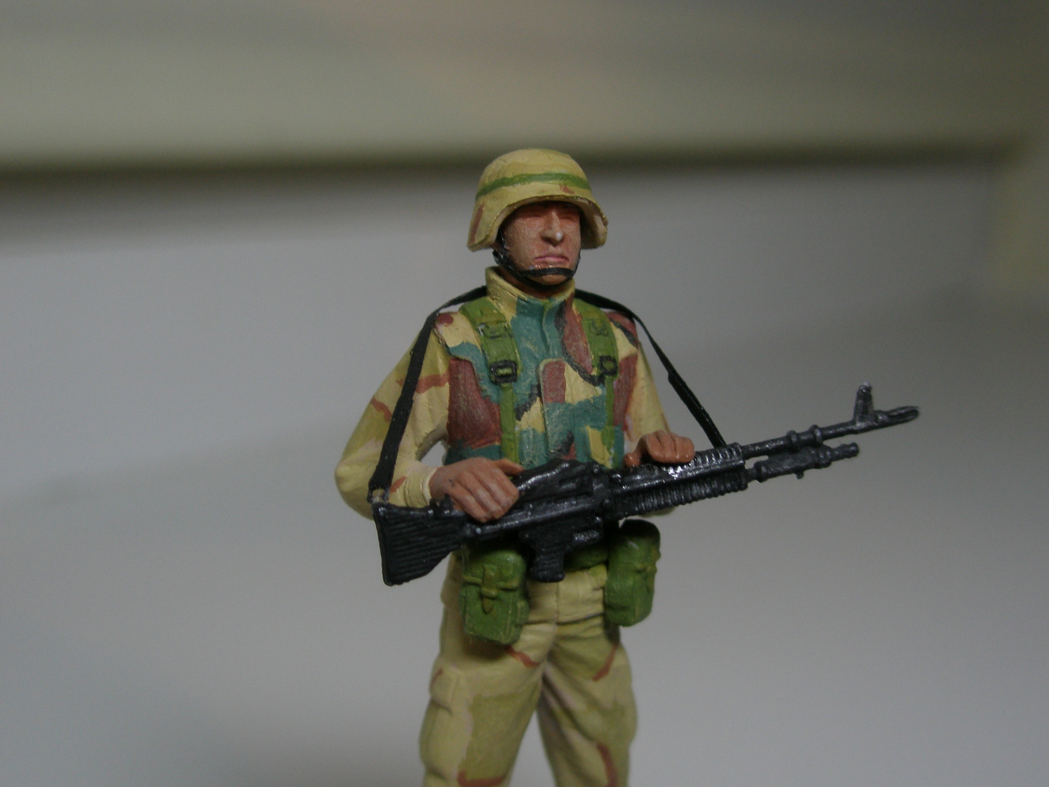 Наконец-то я закончил чвою свою первую фигуру набра ICM "American Elite forces in Iraq" в масштабе 1:35 и выкладываю ее на всеобщее обозрение (учитывая уровень работы отсылать для галереии не рискнул). Окрашивалось Харьковским акрилом "Хома", из доработок пулеметный ремень и ремень на каску - сигаретная фольга. Пытался также из фольги зделать нарукавные нашивки первой пехотной дивизии, но к сожалению ничего не получилось.