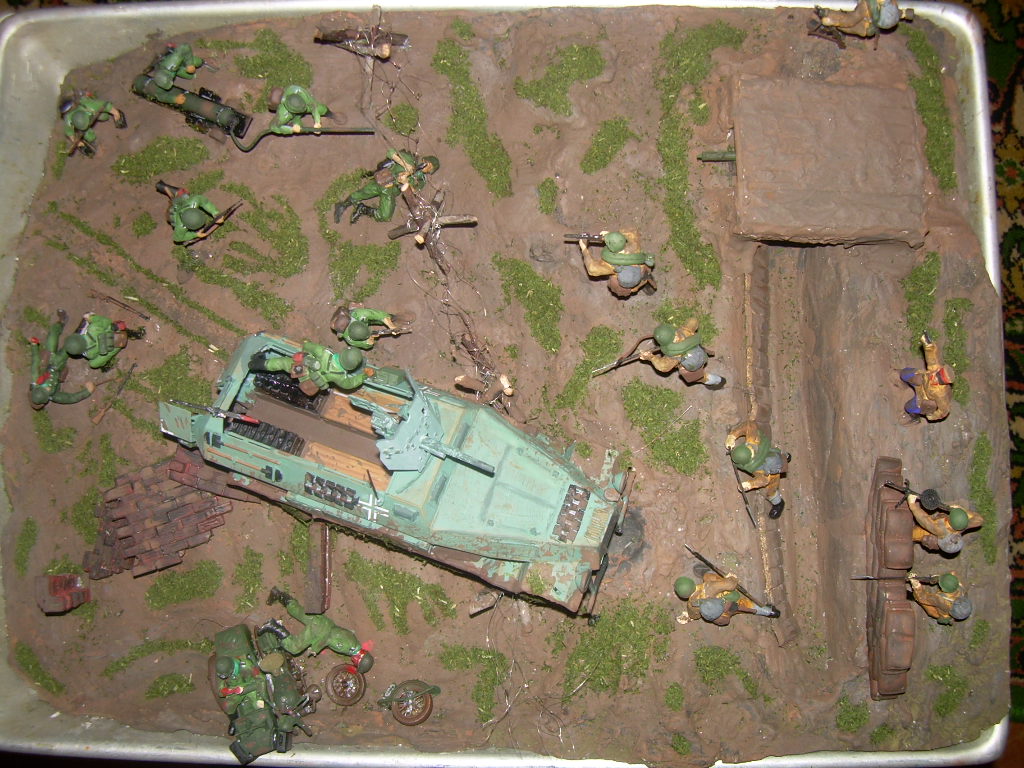 Исполнение замысла. Мало натыкать фигурок. Для разглядывания надо больше фишек в таком объемном деле. Противотанковые ежы - хорошо, но мало. Как вариант - несколько разный по величине рельеф местности. Типа, здесь может ханомаг проехать, а тут только пехота пройдет. Потом, исполнение самой местности. лучше брать за основу то, что видели сами. Провереный способ. Не доверяете себе - фоткайте. На фотик, на телефон. Потом сверяйтесь. Потом - реалестичность. В Вашем случае - кладка из мешков - фантастика. С большой буквы "Ф". А любая такая деталь может испортить впечатление. То есть вывод - заранее продумайте, что и как у вас будет на дио. Потом подумайте - а могло ли это быть. Неуверены - спросите/поищите в инете, щас возможностей многоооо.