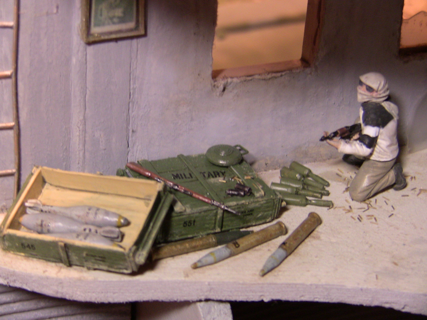 RECOILESS RIFLE на крыше для увеличения сектора обзора. Пробовал ставить её снизу ни один день, но даже такие размеры диорамы были слишком маленькие чтобы не выглядело не гармоничным что RECOILESS смотрит буквально в борт BRADLEY. Ведь по задумке и баррикада на дороге и RECOILESS на крыше направлены в сторону предполагаемого направления атаки американцев. Повстанцы для ближнего боя используют РПГ, а для дальнего - Recoiless rifle.