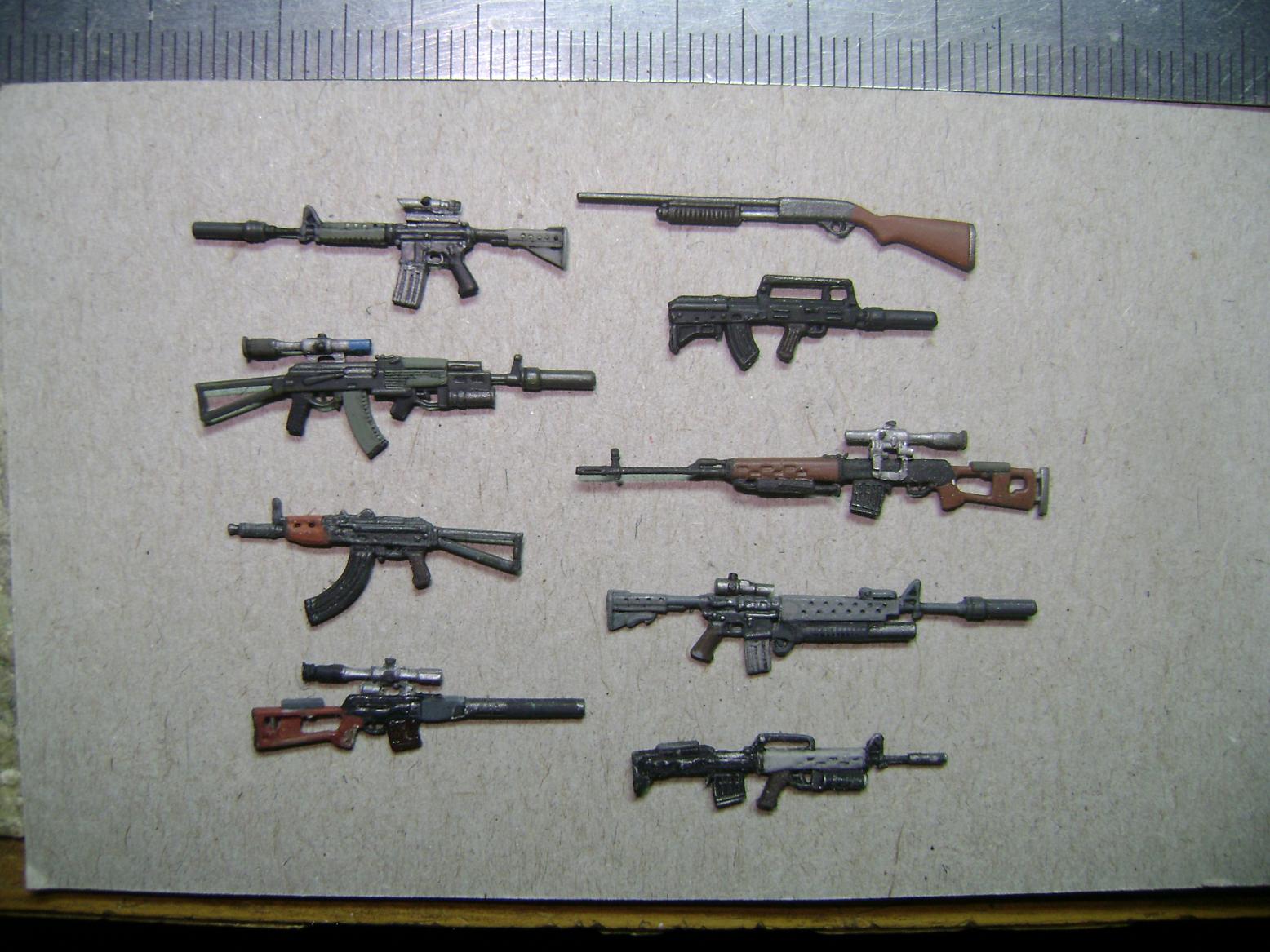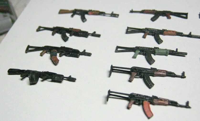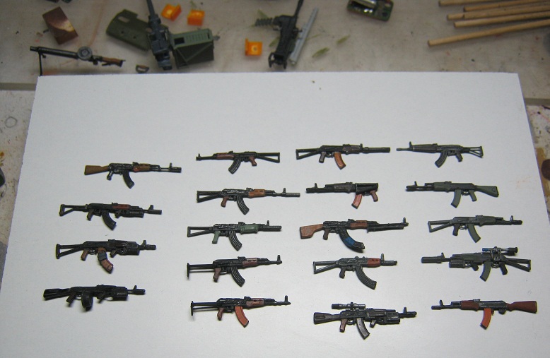Что бы не создавать новые темы решил продолжить эту. Семейство АК из разных наборов. "Танк", ICM, Звезда, Дрэгон. Менял рожки и приклады. Подствольники высверлены.