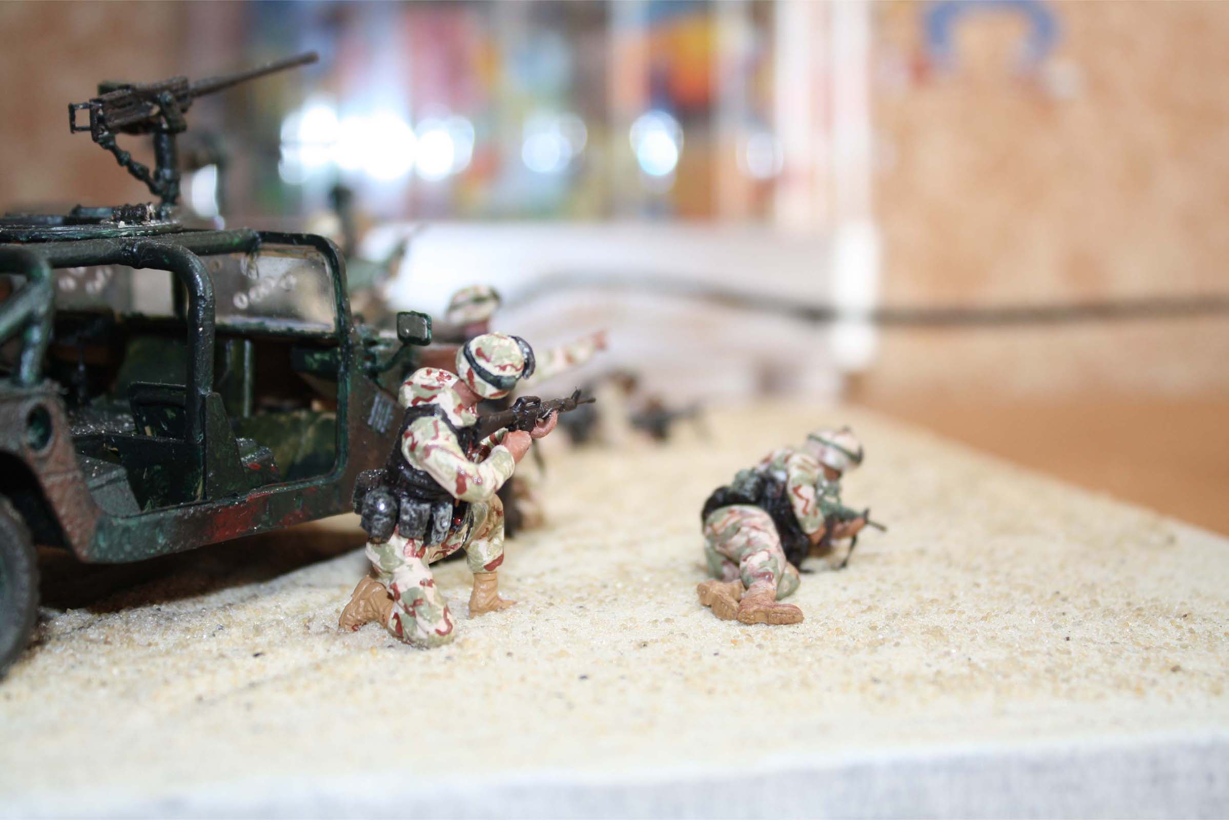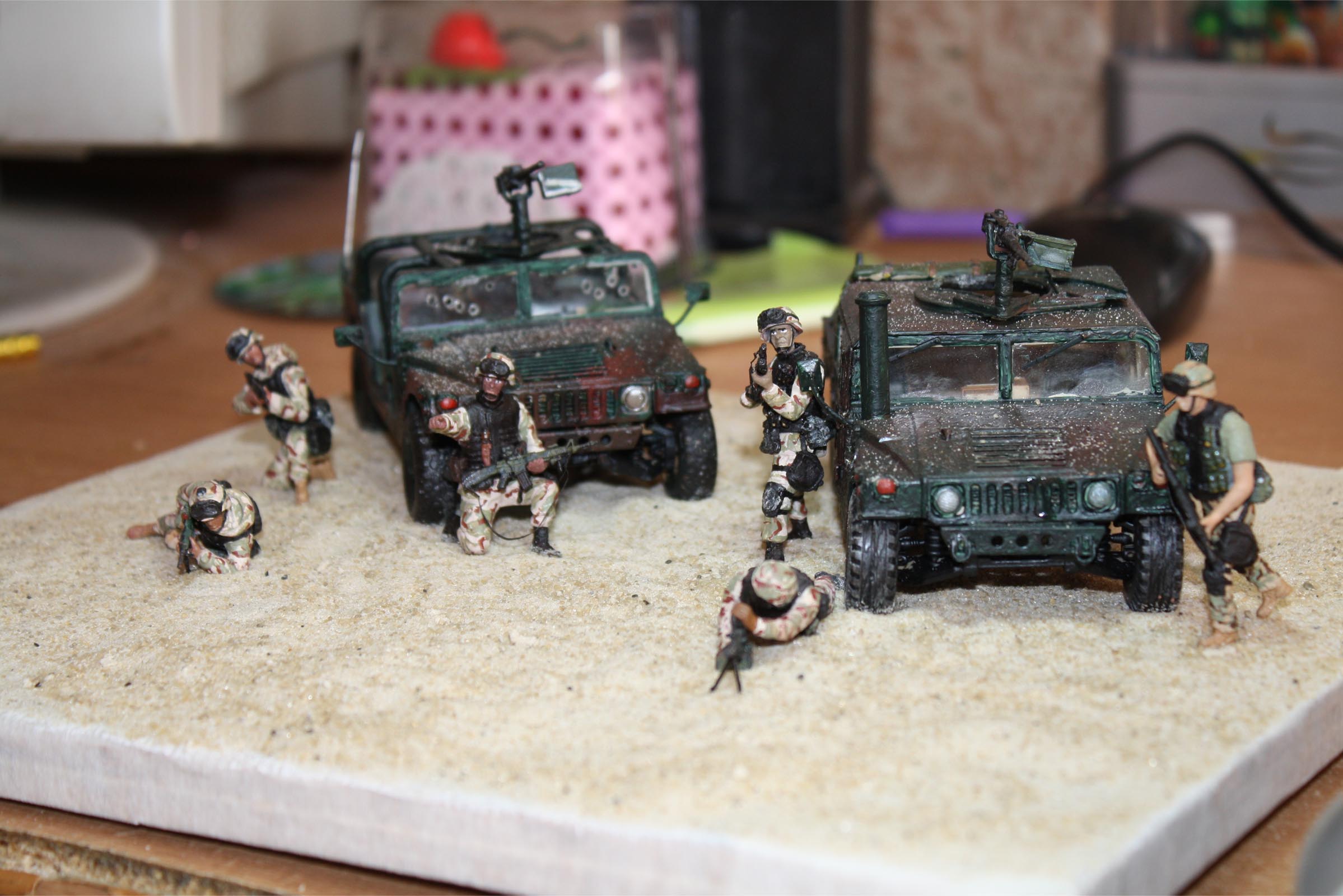 Выставляю на ваш суд свою первую работу. Посвещенную событиям в Ираке. Занимаюсь моделизмом меньше года, поэтому работа без какой-либо исторической нагрузки.Тонировать не умею, читал литературы, но на деле не получается, надо, чтоб кто то показал наглядно, т.к художественные навыки отсутствуют напроч.Для ее создания использовал наборы фигур "TRUMPETER" морпехи в ираке и 101-ая воздушно десантная. хаммер фирмы "моделист" и переделанный "ЗВЕЗДИНСКИЙ". красил акриловыми красками "ЗВЕЗДА" и "гамма студия", разумеется кисточками.Все это дело размещено на кварцевом песке.Надеюсь на "учебку" работа потянет, я паристягнулся и жду ваших отзывов.