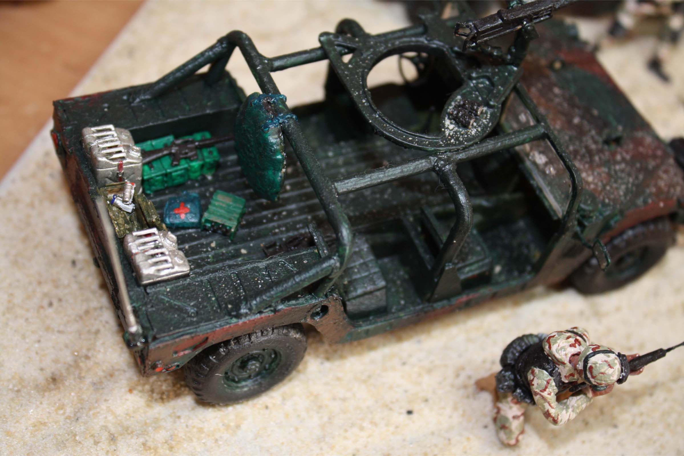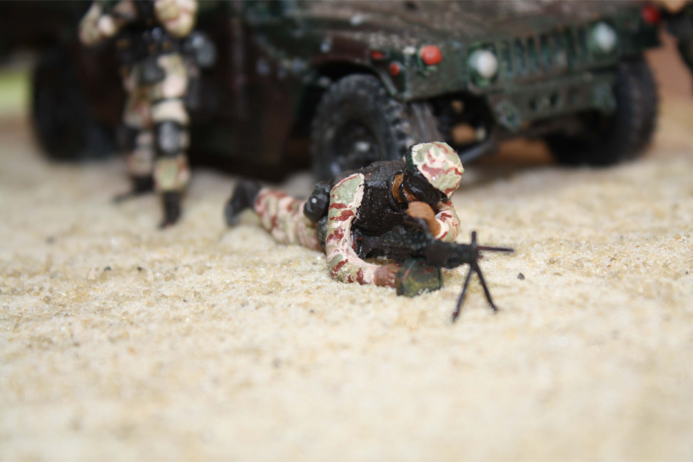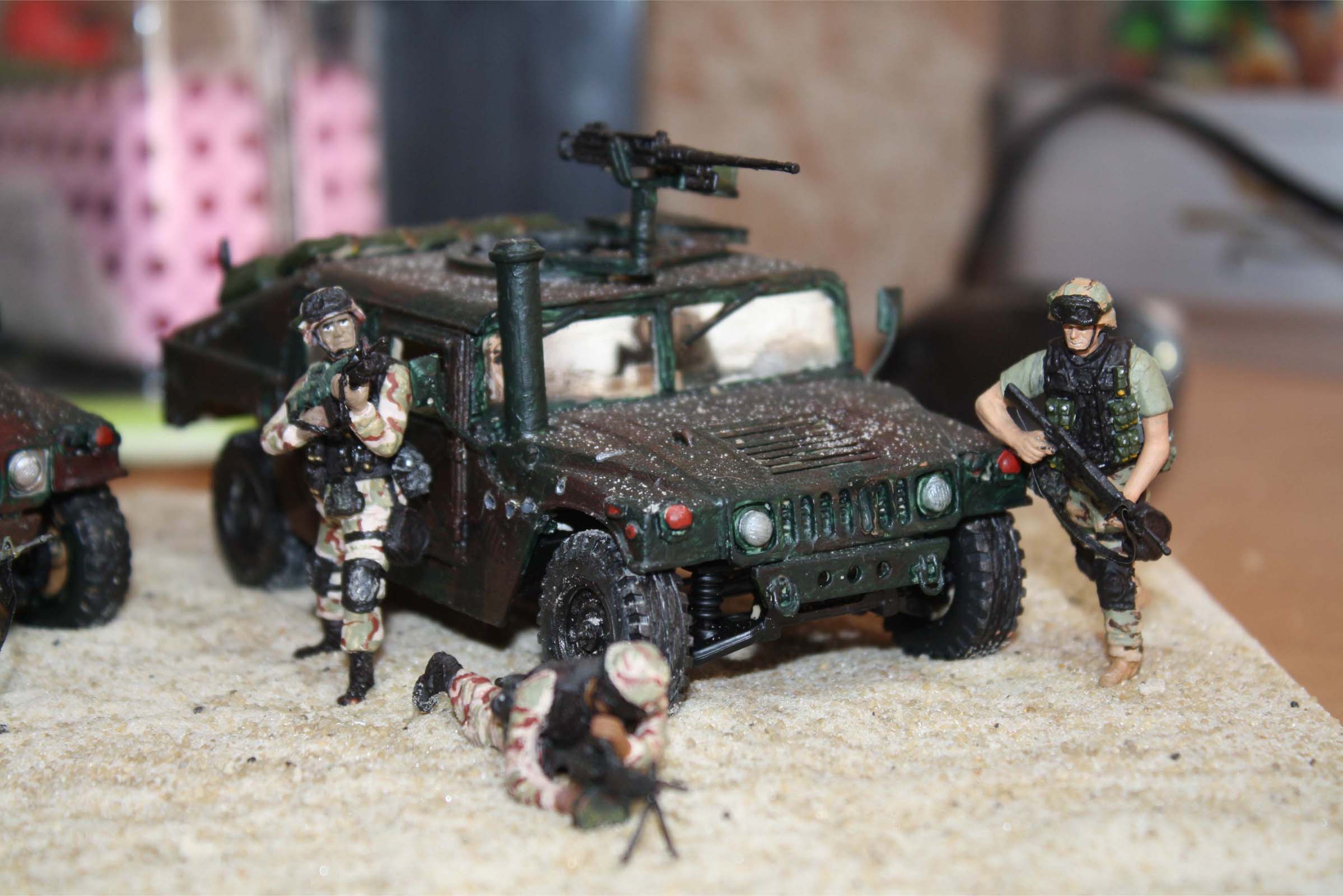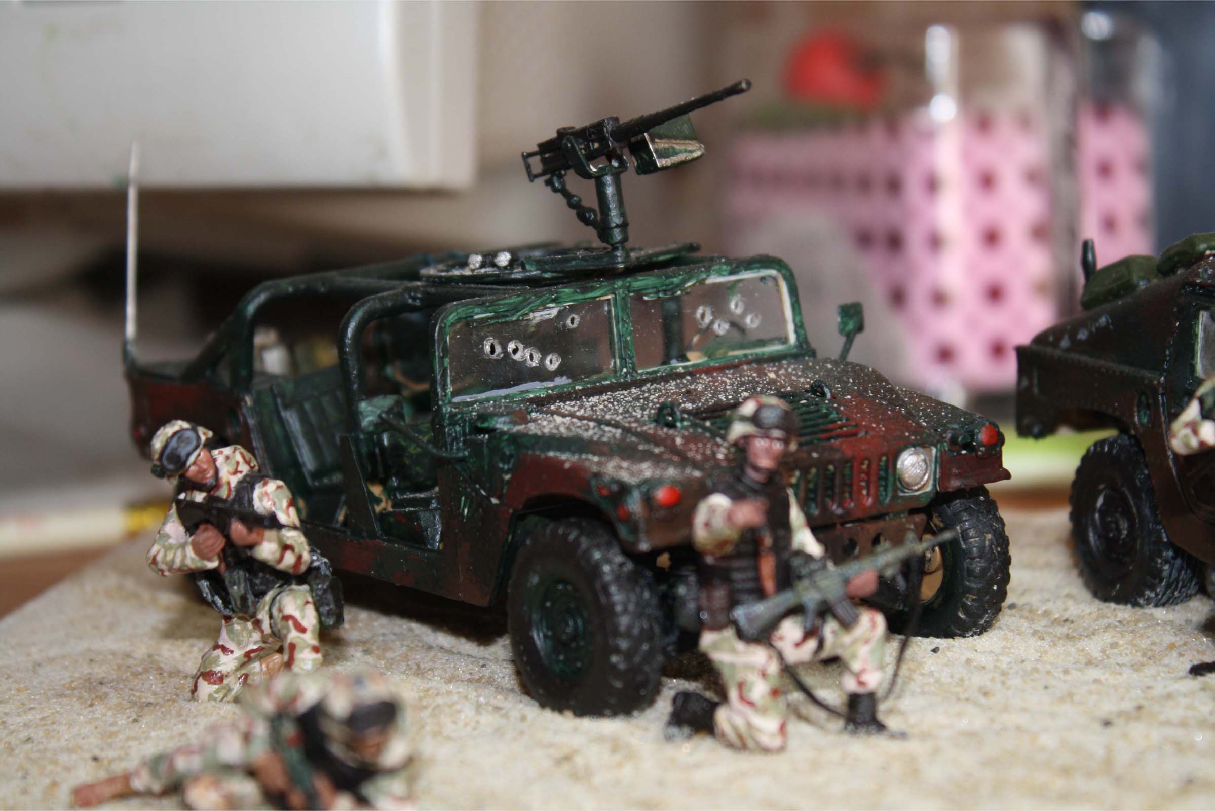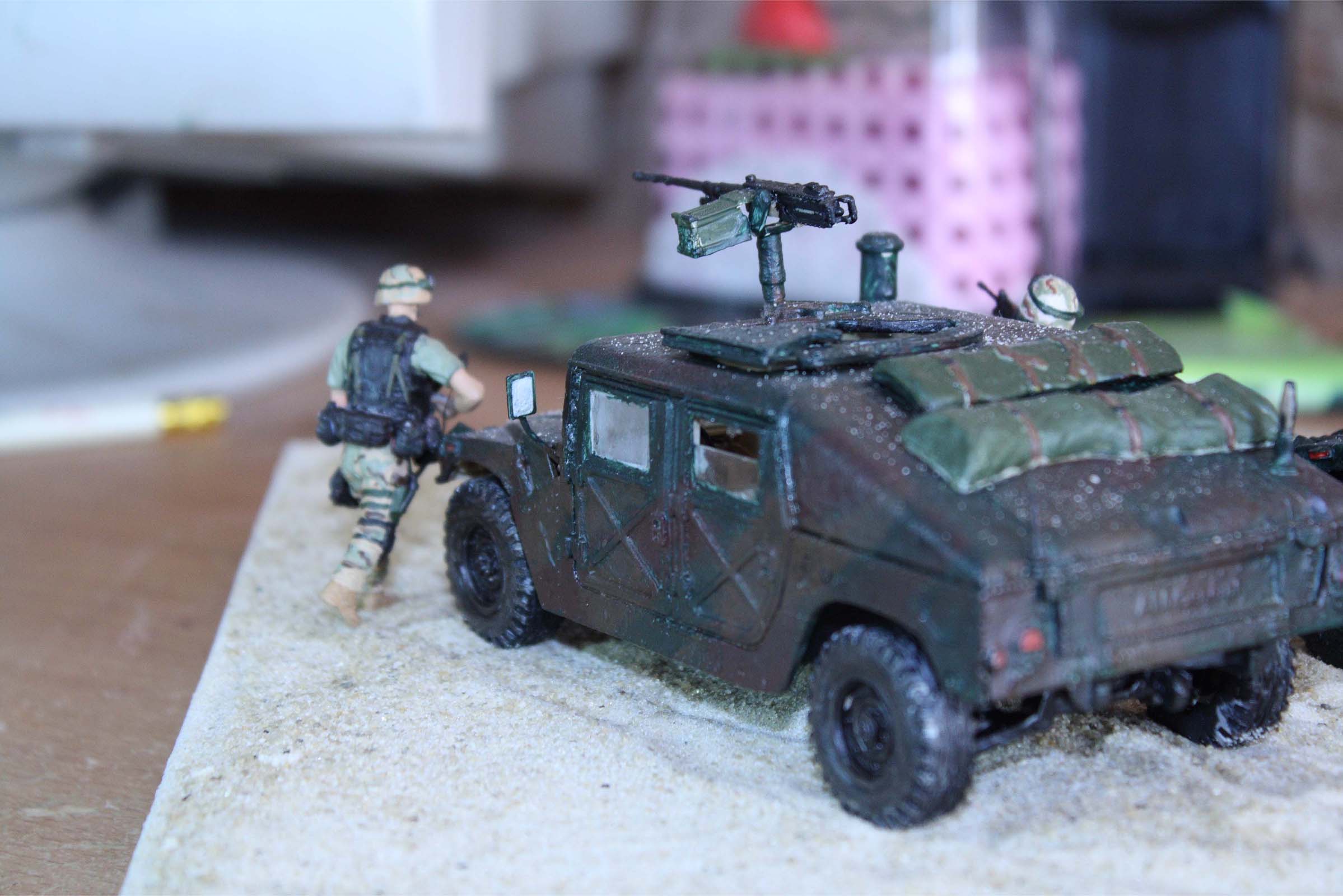 о, эти бедняги хаммеры перекрашивались много раз, сначала цвет был предложенный коробкой, затем после просмотра "поколение убийц" покрасил в пустынный камуфел и снова как в фильме не получилось, решил покрасить в лесной, как в моем настольном фильме "падение черного ястреба"