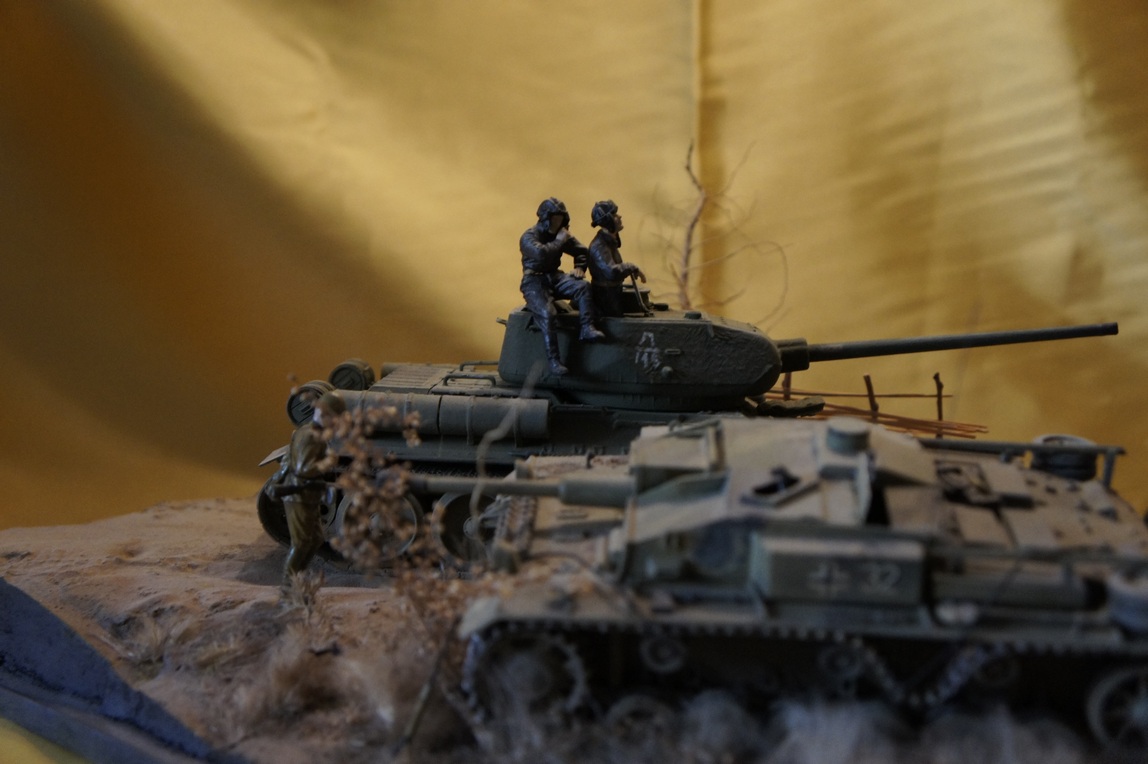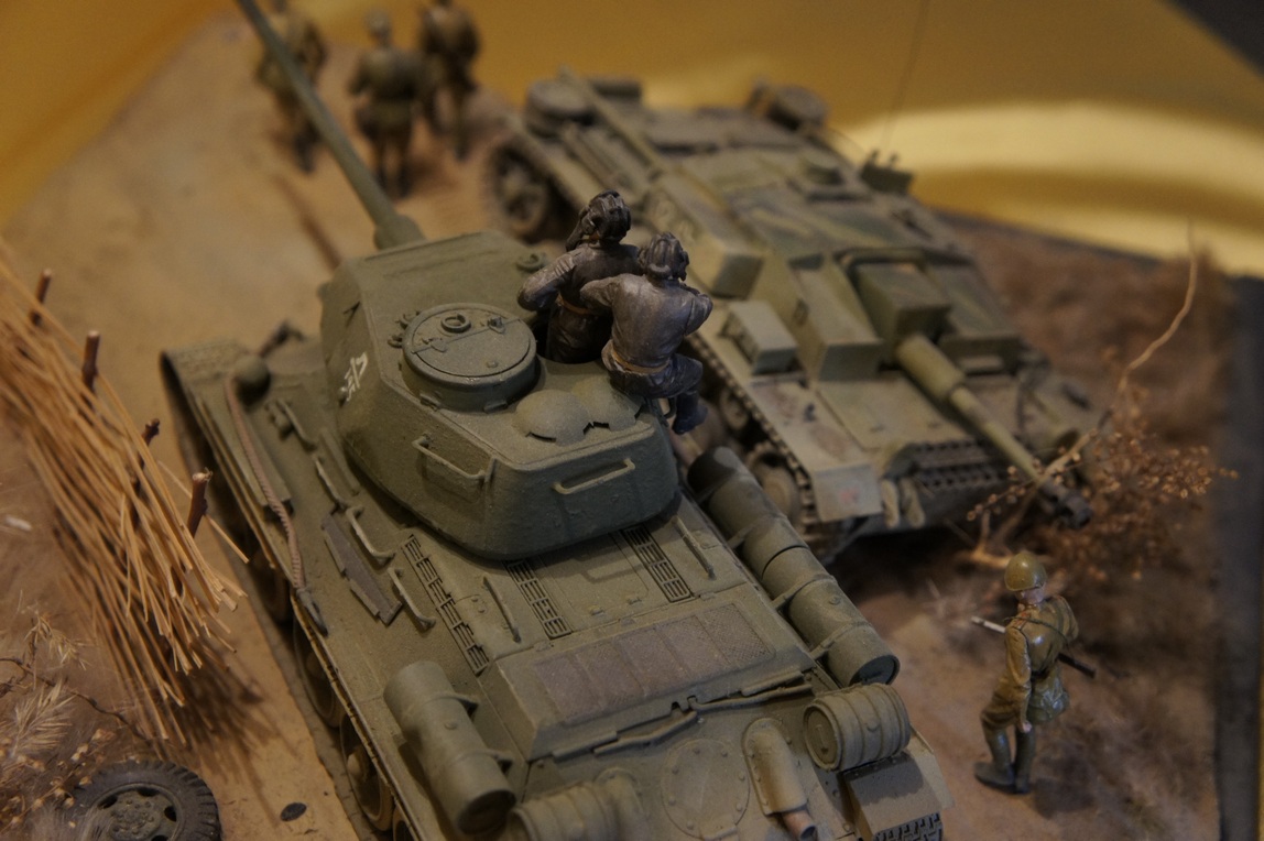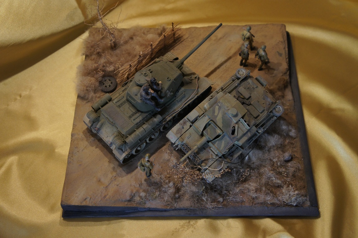 Моя первая диорама,собиралась в 15 лет..до этого момента я конечно же пытался что то сделать,но крме танка поставленного на кучу песка ничего не выходило(11-12 лет).Действия разворачиваются на украинском направлении а 43м году.Танк т-34 от звезды,крашен кистью,но с повышеним уровня перекрашен аэрографом,люди от miniart,крашены кистью.
