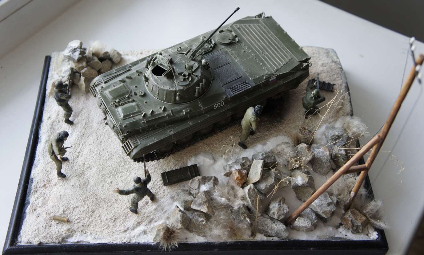 Все модели от звезды,бмп без собственных доработок,крашена аэрографом.Масштаб 1\35.Действия происходят на северном кавказе,во время чеченской компании...