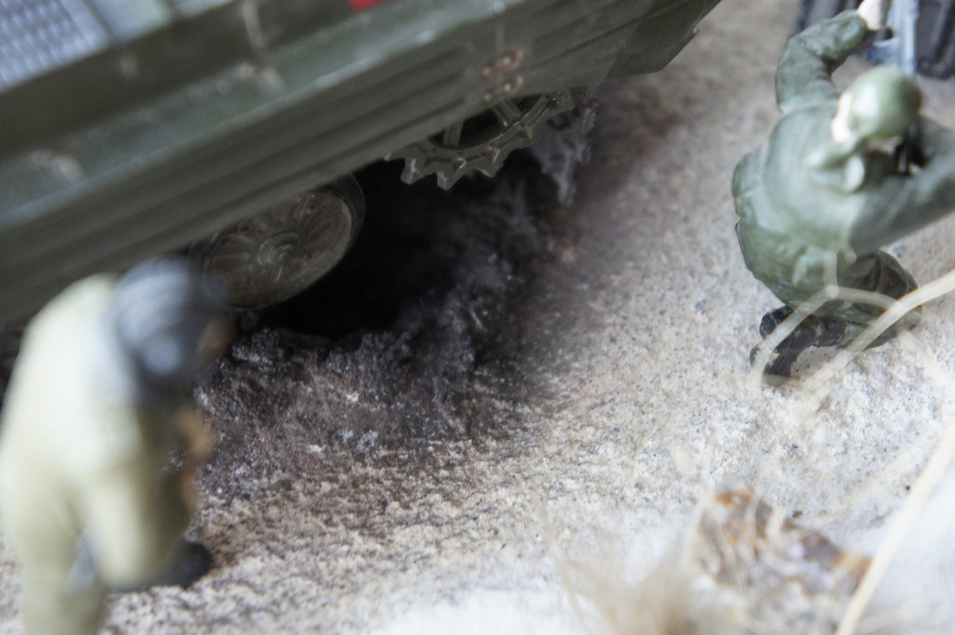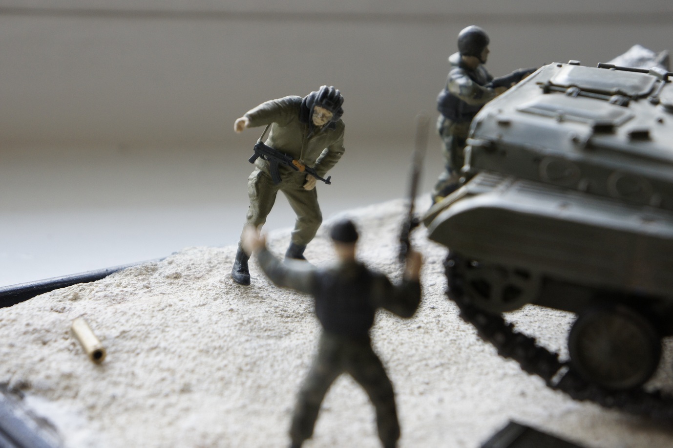 На будущее: если делаете диораму, то чётко определите, что хотите показать, а потом думаете,как это показать. Диорама тогда будет удачной, когда у зритьелей не останется вопросов: а это почему, а этоздесь зачем? Ну и исполнение. Нет, как для новичка вполне ничего. Но, думается, лучше сначала отточить технику исполнения, а потом браться за масштабные проекты.