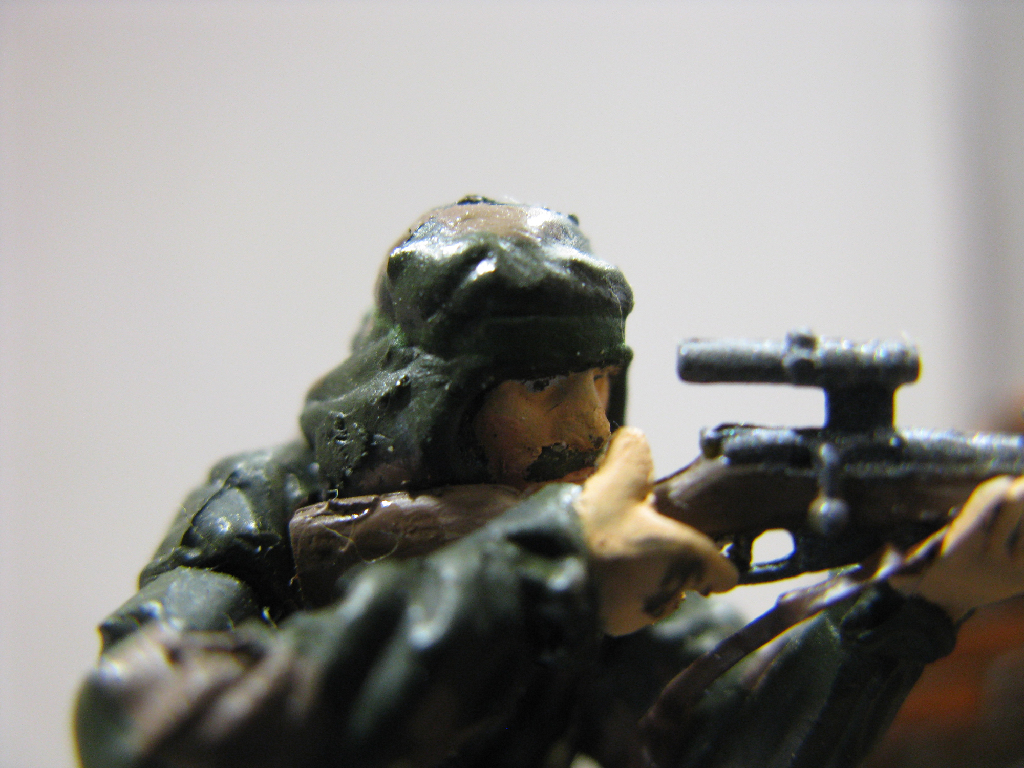 1)Плохо обработана фигура до покраски-видны следы стыков пресс-форм на фигуре и на винтовке.