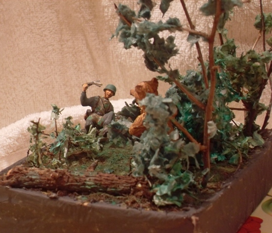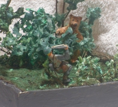 Хотел бы представить результат своего первого диорамостроения.Немецкий десатник пробираясь по лесу натыкается на Хозяина и, есстественно, пугается.Немец из набора ЗВЕЗДЫ подвергся переработке: правая нога и руки от другого десантника из этого же набора.Деревья сделаны из веточек какого-то кустарника, трава- сантехнический лён. Листья из окрашеной бумаги. Медведь самолепный из массы ДЖОВИ. Основание- папье маше.