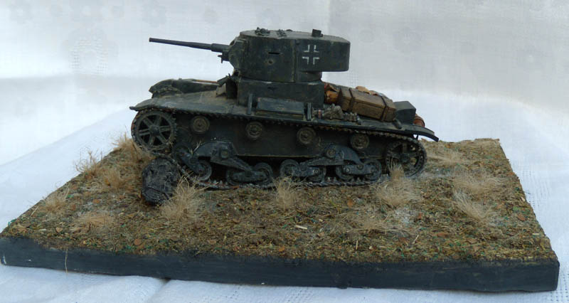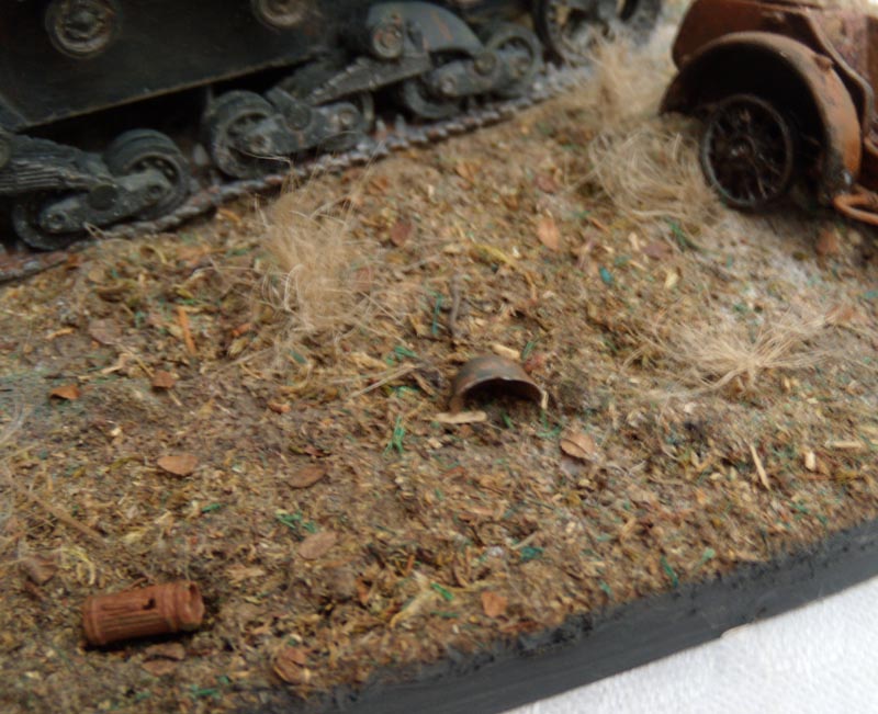 Если это диорама, то композиция неудачна. Танк смещен от центра в угол и образуется ничем не занятое пустое место. Из-за этого пропадает весь смысл, если он конечно был. Если это подставка под танк, то она слишком большая, и совершенно не гармонирует и не акцентирует внимание на танке. Танк просто теряется на такой подставке.