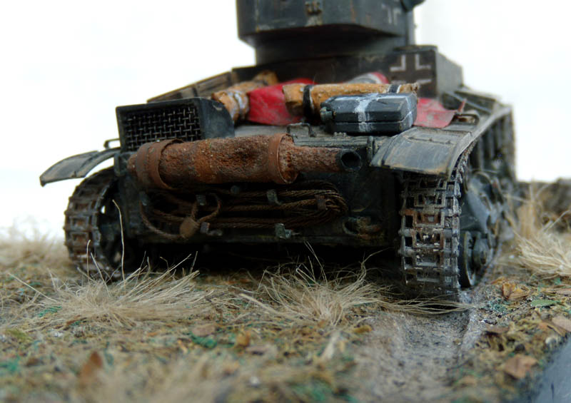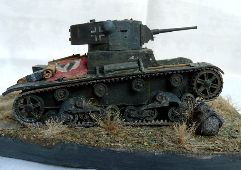 kot, понравилось основание, на него пару фигурок для оживления композиции было бы еще лучше. Заглушки лючков для стрельбы из личного оружия нужно было срезать, они изнутри закрывались пластиной. Не очень получилась окраска брезента и креста на канистре, а вот прогиб гусиницы смотрится эфектно.