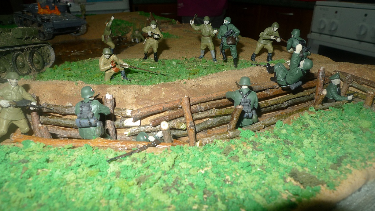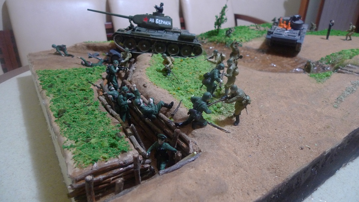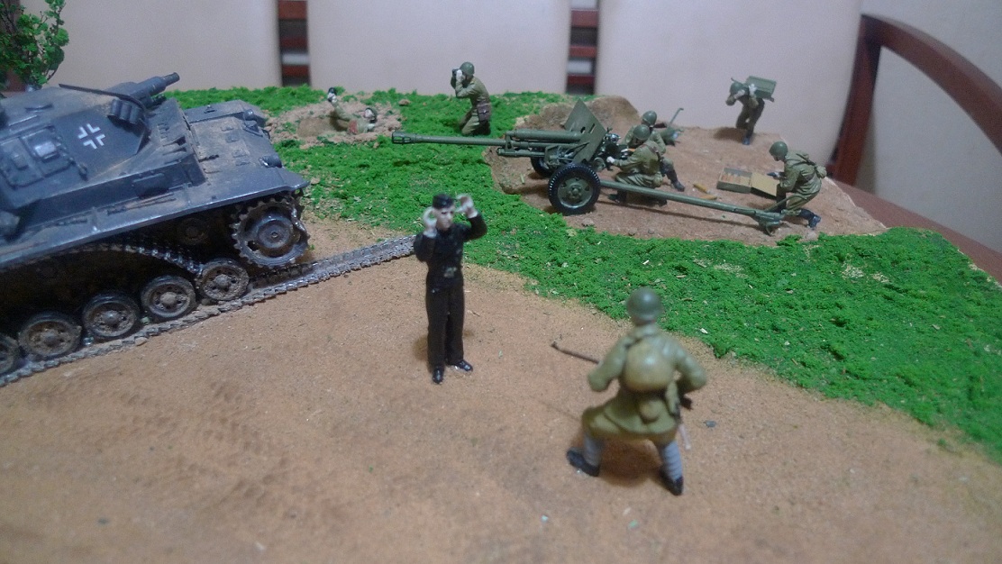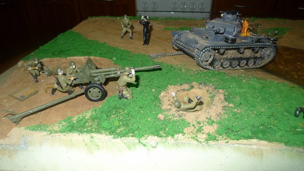 Фигурки - разные: ЗИС-3 с расчетом Миниарт, немецкий танк - Тамия, русские солдаты и Т-34 - Звезда, немцы - звезда и какие-то "вражеские", не помню.