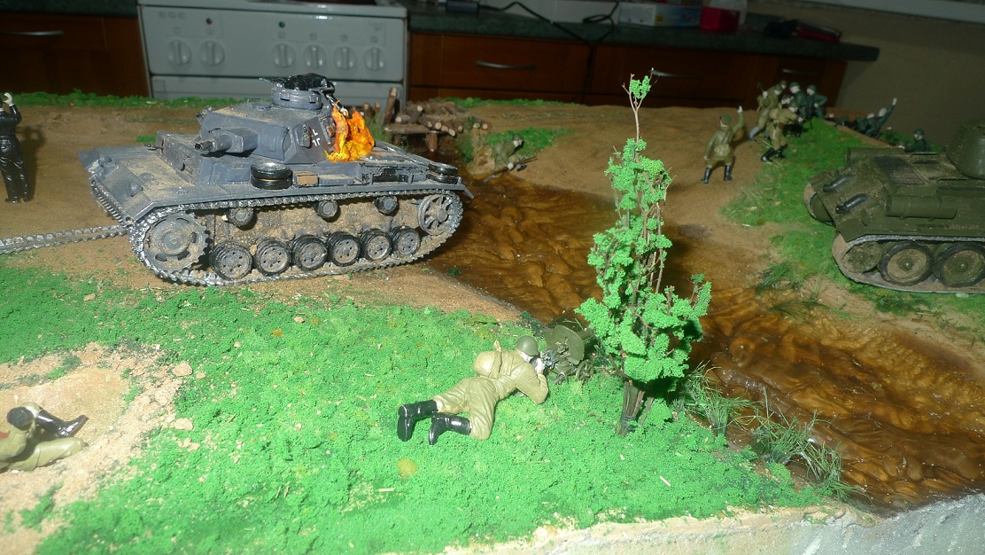 Ну мне кажеться,что трава слишком зелёная,очень близки позиции наших и немцев,Т-34 и PZ-3 встречались редко,а если немец с 41-го то он должен быть ржавым.А роспись фигур нечего.А человек сзади 1:35?