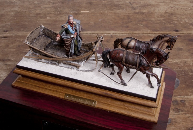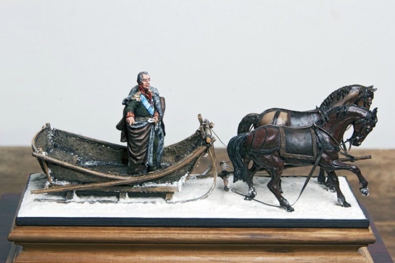 про сдерживающего лошадей думали(с братом делали)только заранее купленная подставка не позволила разместить еще персонажа.постромки сдумали ослабить опять же из-за ограниченного пространства рассчитывая на то что кони двинут и натянут.безопасность фельдмаршала точно под угрозой я бы так стоять в санях не стал.работа первая и не скрою,спешная.