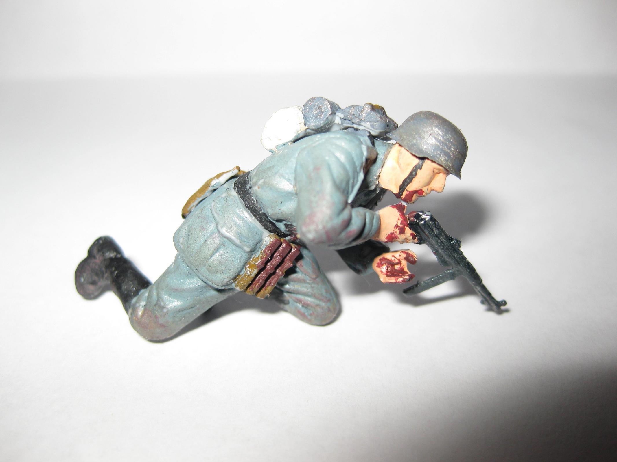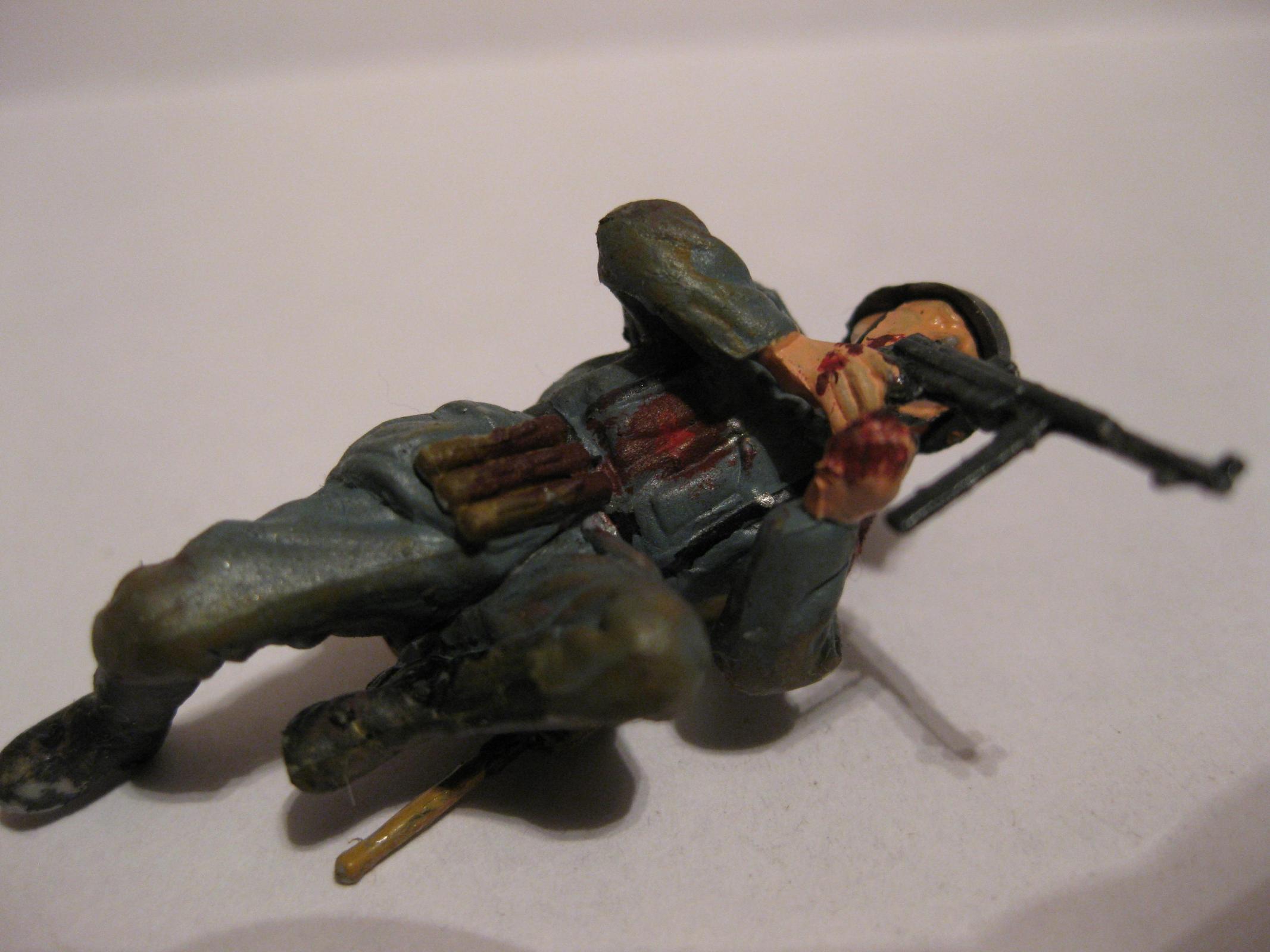 Интересная динамичная поза.Судя по всему получил штыком в пузо, так что пятна крови не на месте. Вообще лучше смойте краску и как следует доработайте фигурку: замажьте стыки, подшкурьте и перекрасьте, особенно лицо. Сам периодически балуюсь конверсизмом