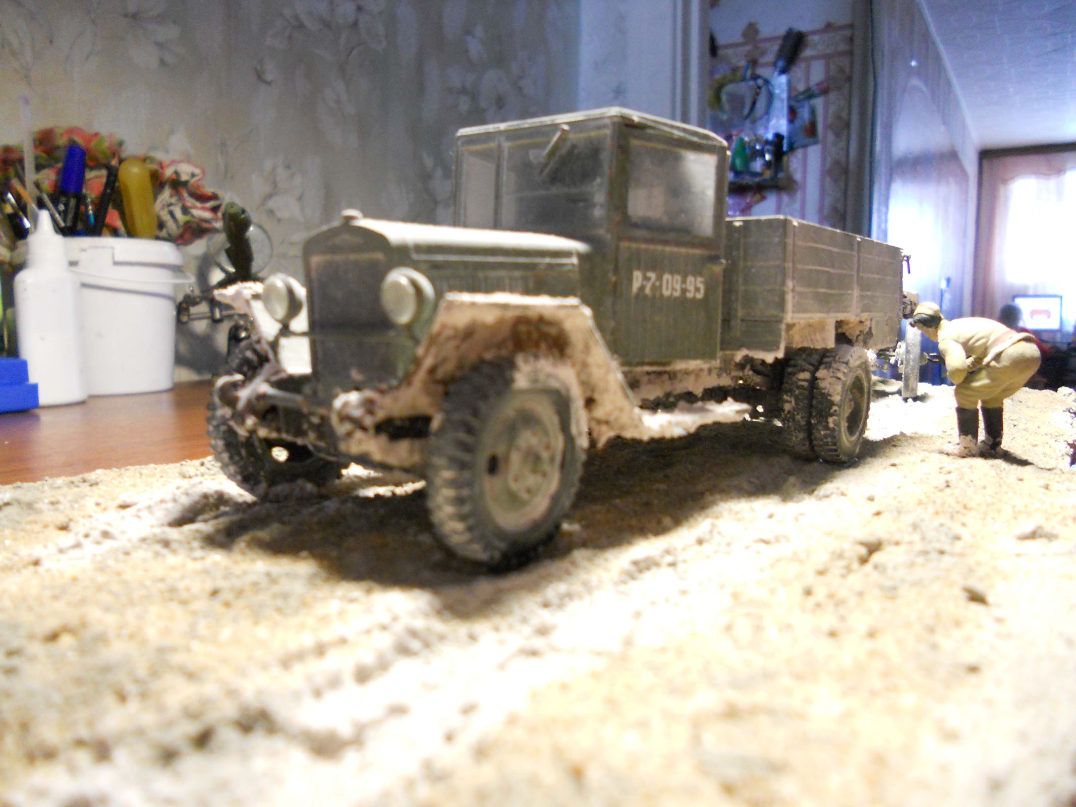 Маштаб модель 1:35 "ЗиС-5В" и "Гаубица 122мм М-30", модели фирмы "Звезда", красил акриловой краской фиры "Звезда". Использован материал для основания песок, цемент, шпаклевку.