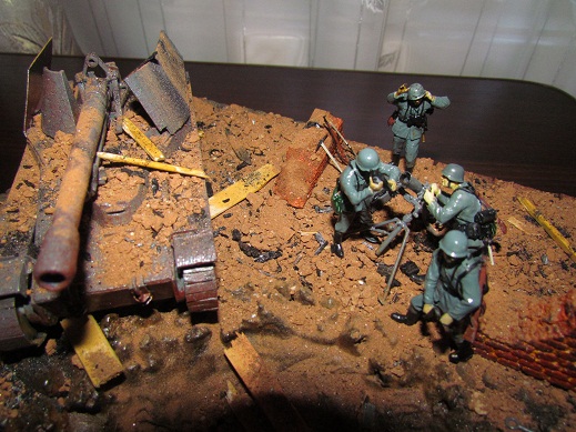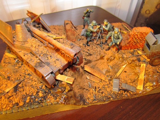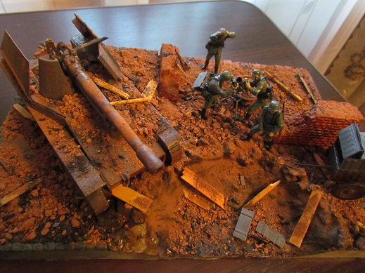 Использовал Набор немецких миномётчиков от "Звезды", самоходка от фирмы "ark models". Самоходку собрал ещё в глубоком детстве и разумеется успел много раз сломать, но когда стал подумывать о диораме, то пришлось восстанавливать её почти с нуля, а именно: заменил гусеницы, броневые листы, ствол пушки. Краски: ржавчина от "Звезды", местами обычная акварель , форма солдат- машинная грунтовка. Основание сделано из простой коробки, воронка- пенопласт, залитый клеем пва с содой и песком, развалины- ренопласт, местами брусчаска из скульптурного пластилина, мусор- крошка кирпича, палочки из под эскимо.