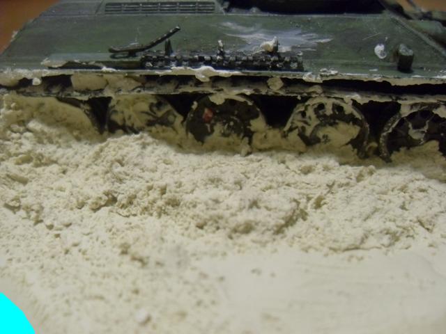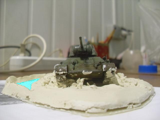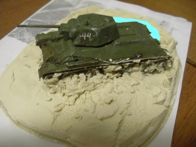 пока не высохло возьми щетинистую кисть и по тыкай чтоб рельеф песочка или земли был и приравняй...а лишнее сними... с танка... У тебя похоже больше на зимнюю грязь когда слякоть и тд...