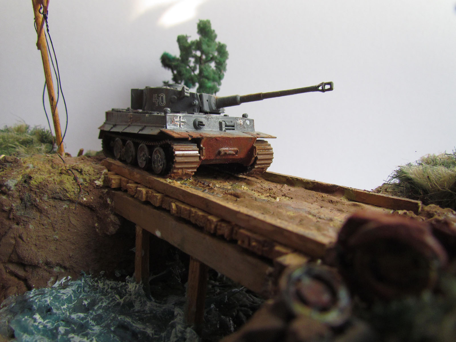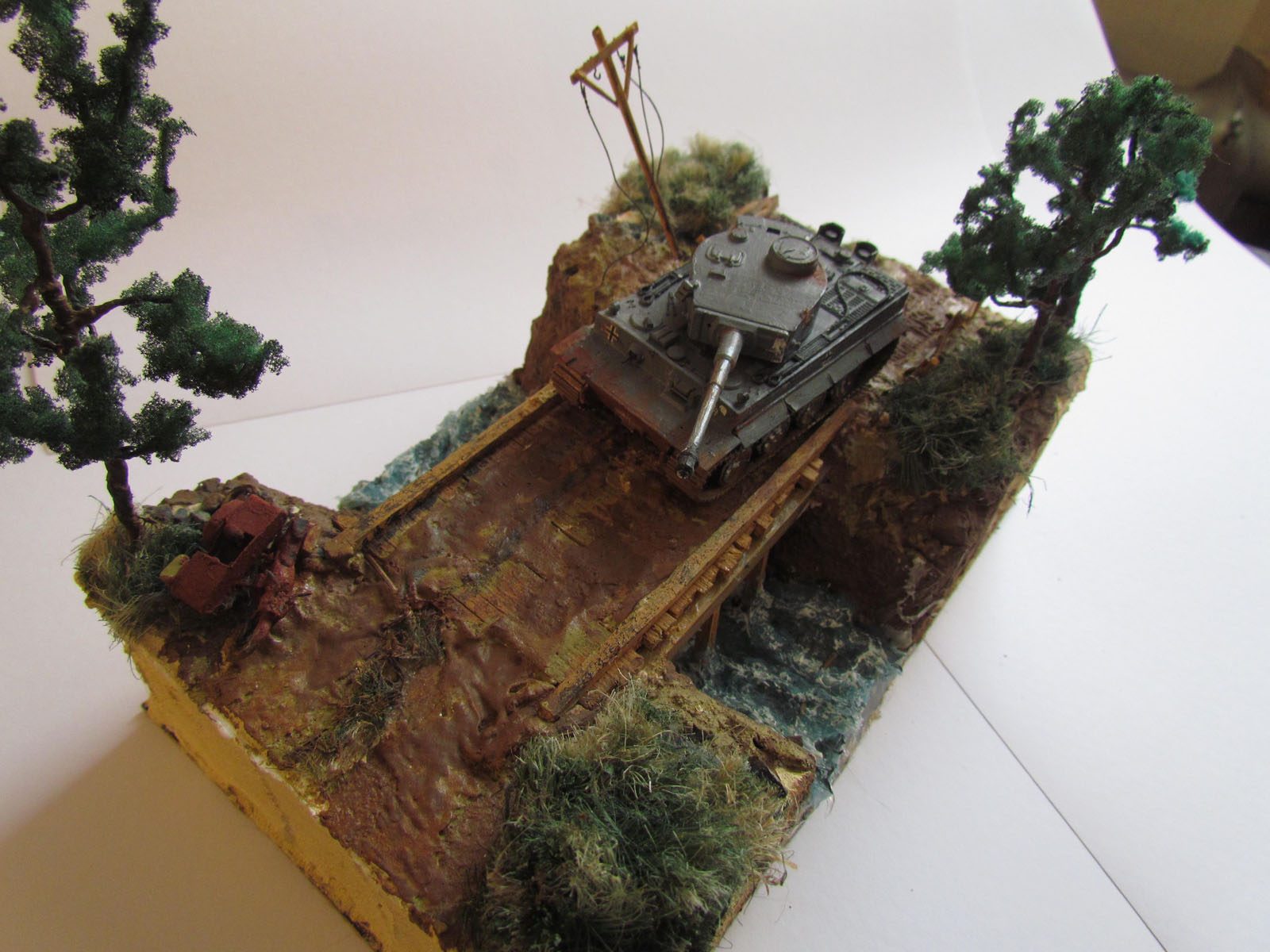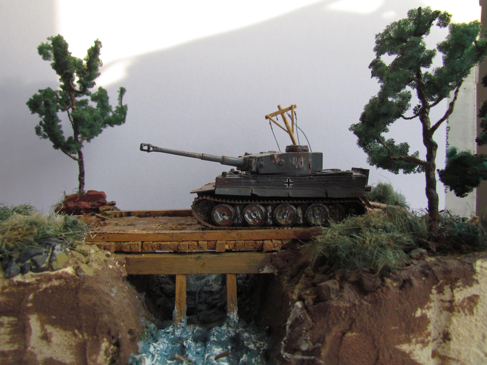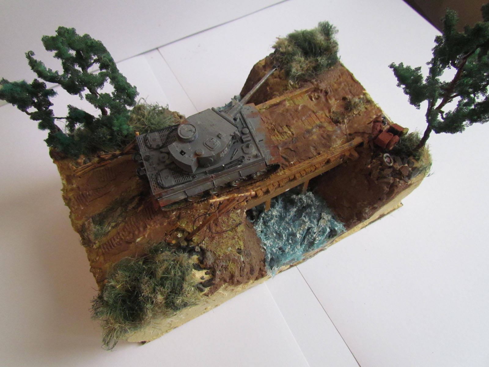 "Тигр" фирмы "Моделист". Окрашивал краской "Супер" от "Звезды". Основа лист фанеры (берега-пенопнаст), покрытие Сухой ровнитель для стен(спасибо ремонту=D)+песок. Мост из резаных и двух целых "штапиков". Много раз переделывал воду , но вроде что-то вышло=).деревья делал из прволки и молотой губки. Трава из сан.тех. льна. Мотоцикл из проволки, эпоксилина, коляска из бумаги, колеса из стопорных шайб)).Сначала хотел мотоцикл пустить перед танком, но не хватило навыка сделать водителя (да еще в таком меленьком масштабе), не проподать же добру - состарил, сломал и внес в диораму)) Это моя первая работа- все замечания и советы приветствуются))) Надеюсь улучшить качество в следуюших работах. Спасибо.