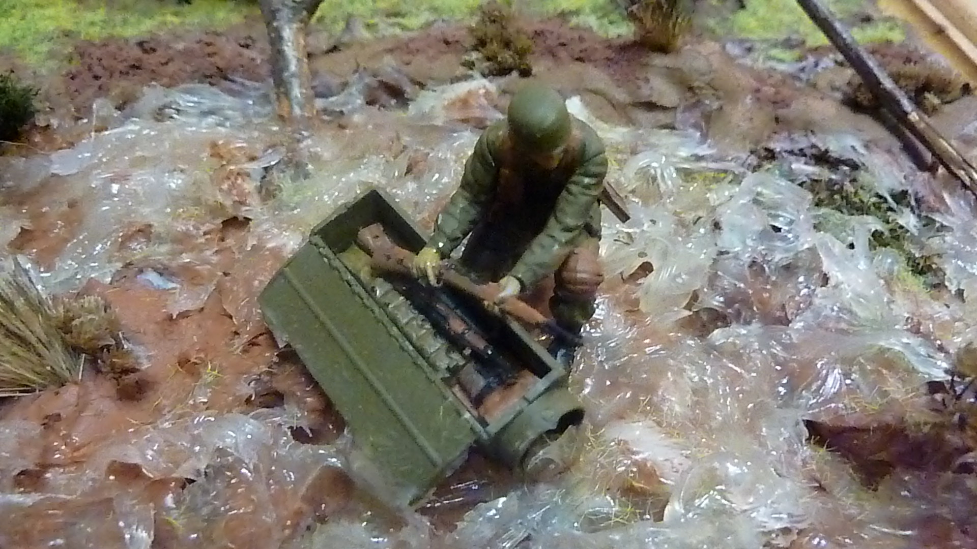 В работе представлен набор фирмы ЗВЕЗДА. (пришлось повозиться с парашютом) основание окрашенный гипс, трава фирма ЗВЕЗДА, ручей герметик прозрачный, деревья обычная трава (можно найти в лесу) высокая трава - кисть. Красил всё Звездовскими красками.(ни ка не могу снять фигуры без блеска).