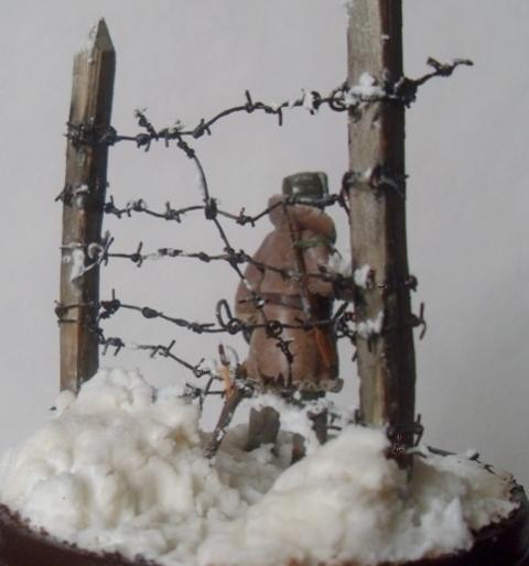 За колючкой -40, какой-то отмороженый урка рванул в бега. Старый конвоир спокоен: далеко не уйдет, не поймают - так замерзнет. В руке держит крюк, с помощью которого цепляли застреленного зэка за одежду и тащили в лагерь. Фигурка из эпоксилина, окрашено акрилом. Делал в 35м масштабе, но какой-то промах был допущен: высота в валенках и ушанке 55мм, но лицо в сравнении с фигурками от "Звезды" больно крупным вышло, карабин как-то не по размеру... Основание: крышка от мармелада, масса для лепки (смесь КЕРА и JOVI). Снег-смесь белого силиконового герметика с ПВА и содой. Хотел отправить в Галерею, но смотрю и понимаю: накосячил, а где - не пойму.
